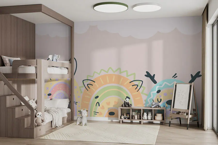 Dobja fel bármelyik szobát ezzel az elragadó falfestménnyel, amely egy mókás állatcsapatot ábrázol játékos szivárványokkal körülvéve. Képzeld el, hogy egy olyan térbe lépsz be, ahol egy vidám nyuszi, egy álmos oroszlán és egy barátságos medve fogad minden nap – hogyan ne mosolyognál? Ez a falfestmény tökéletes gyerekszobákba vagy játszószobákba, és egy csöppnyi szeszélyt és melegséget kölcsönöz. A lágy színek és a bájos minták vidám hangulatot teremtenek, és a falakat a képzelet vásznává varázsolják. Olyan, mintha egy mini szafari lenne otthon. A gyerekek szívesen mutogatják majd új szőrös barátaikat, a szülők pedig talán éppen szivárványokról és kalandokról álmodoznak majd. Teljesen elragadó, nem igaz?