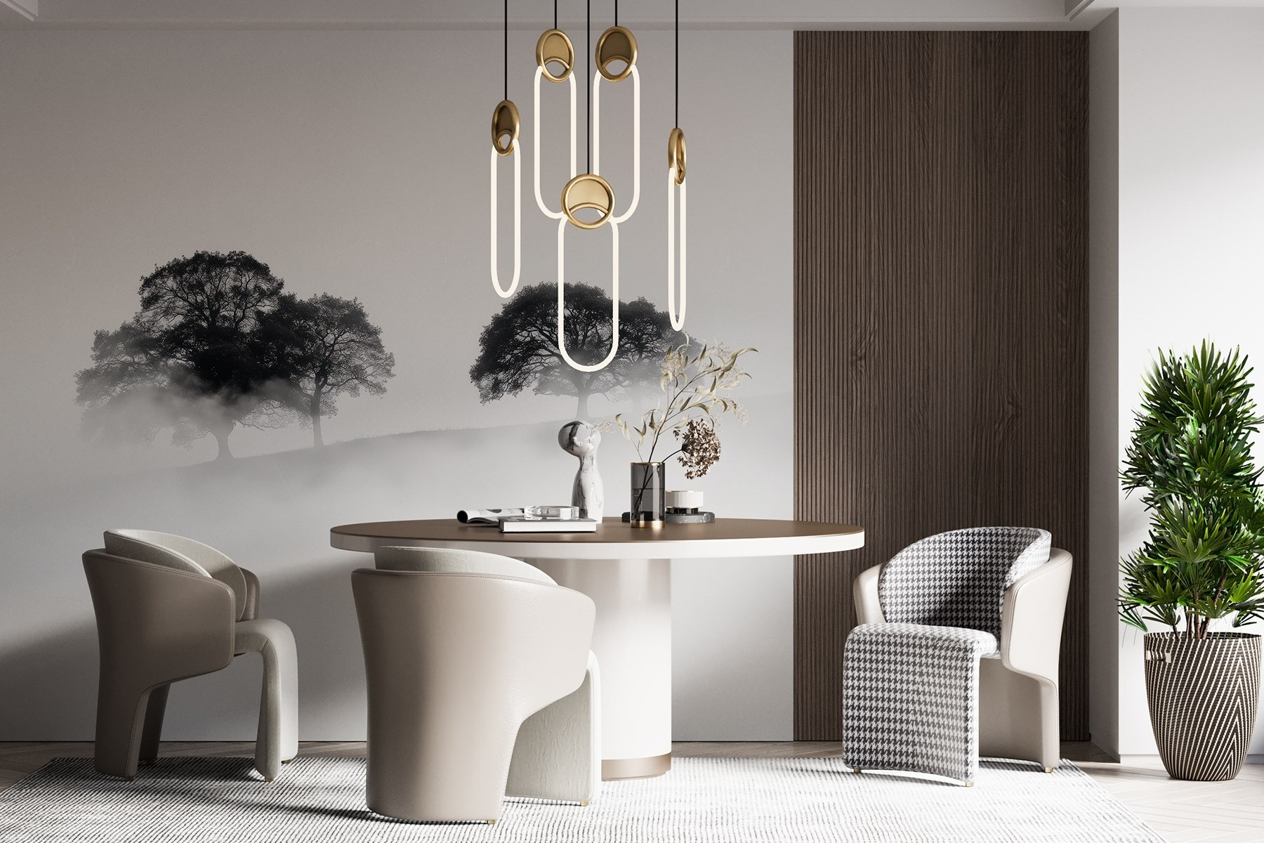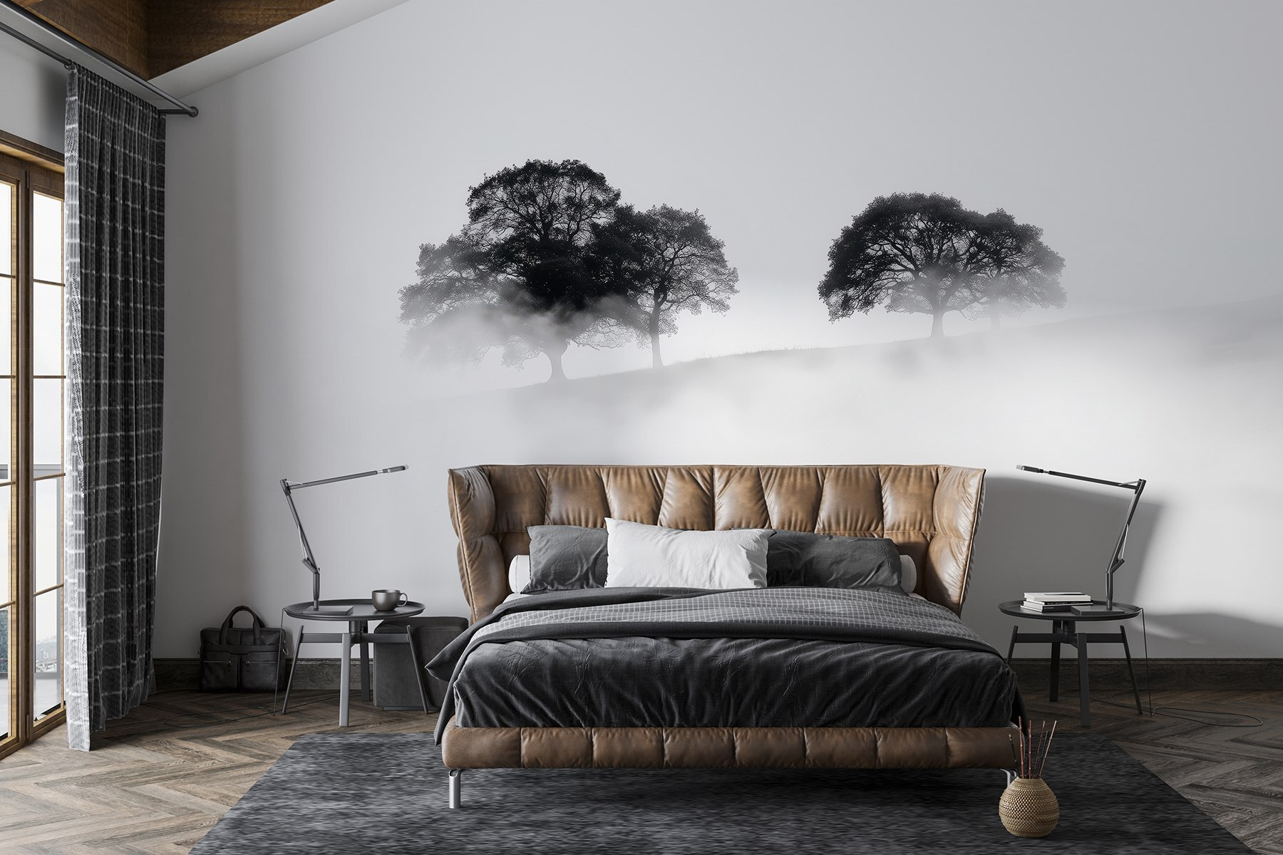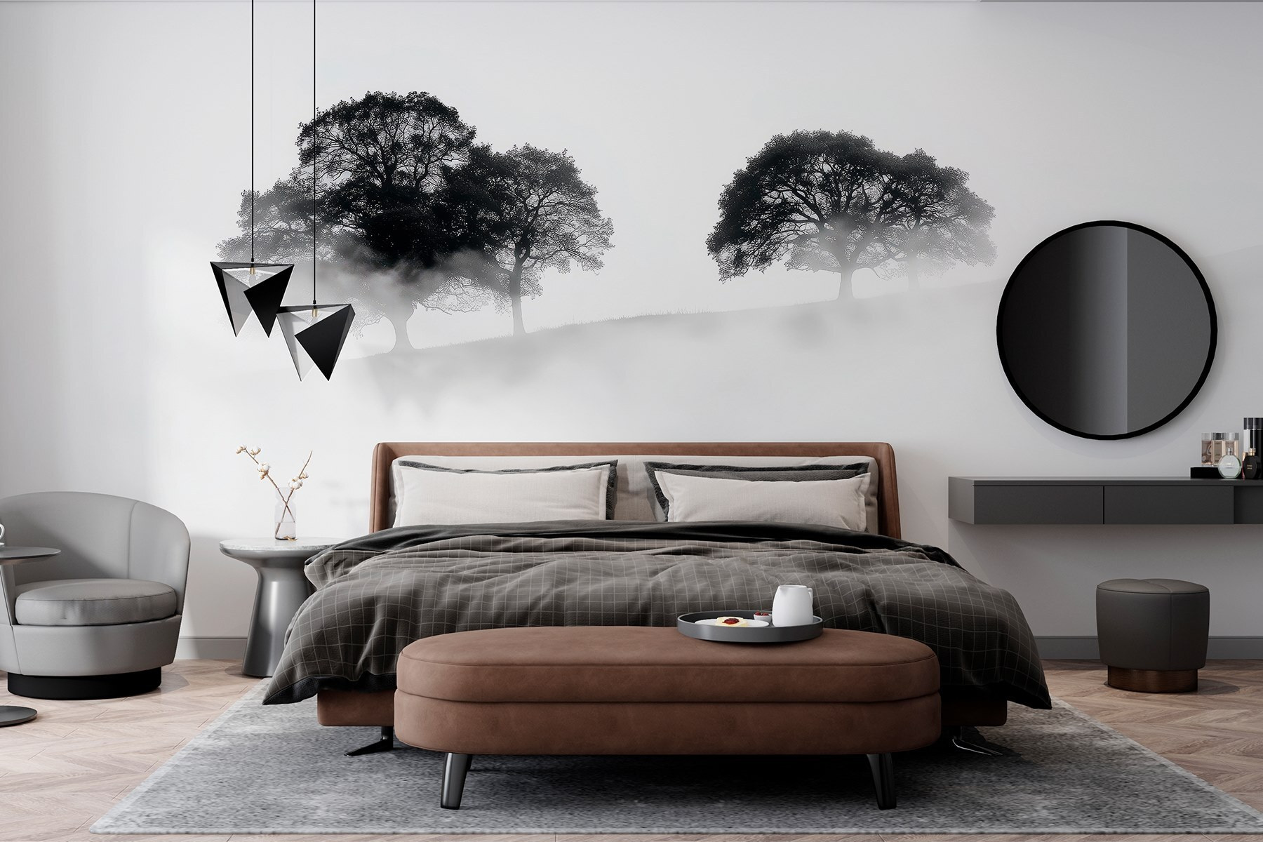 Bármely szobát nyugodt meneküléssé varázsolhatsz ezzel a varázslatos, ködbe burkolt fákat ábrázoló falfestménnyel. Képzelje el, ahogy belép a helyiségébe, és azonnal érzi, ahogy a nyugalom átjárja, mintha egy csendes reggelen a vállát lágy köd ölelné körbe. A sziluettek visszafogott eleganciája titokzatosságot áraszt, amely tökéletes beszélgetés vagy elmélkedés indítására.