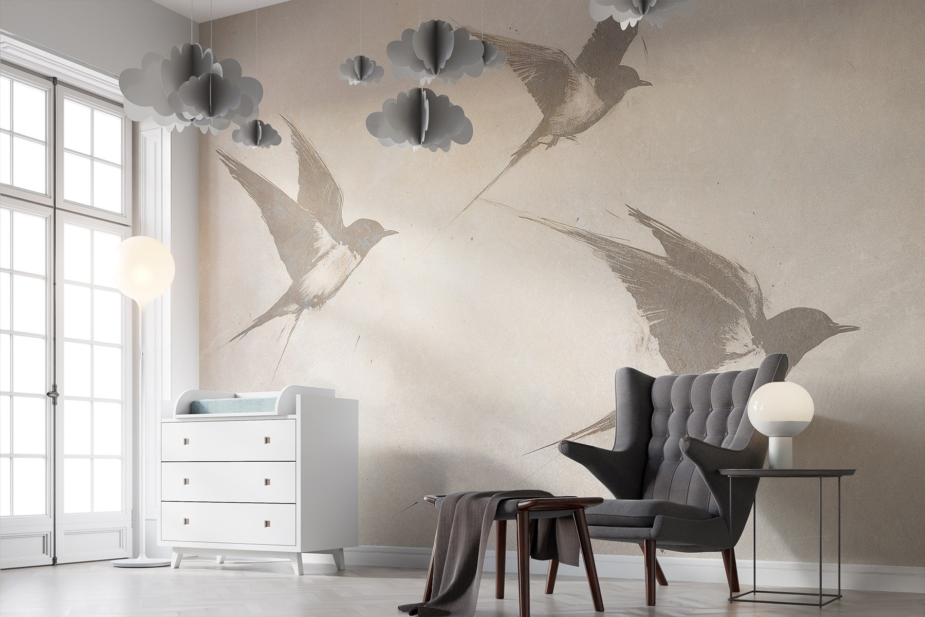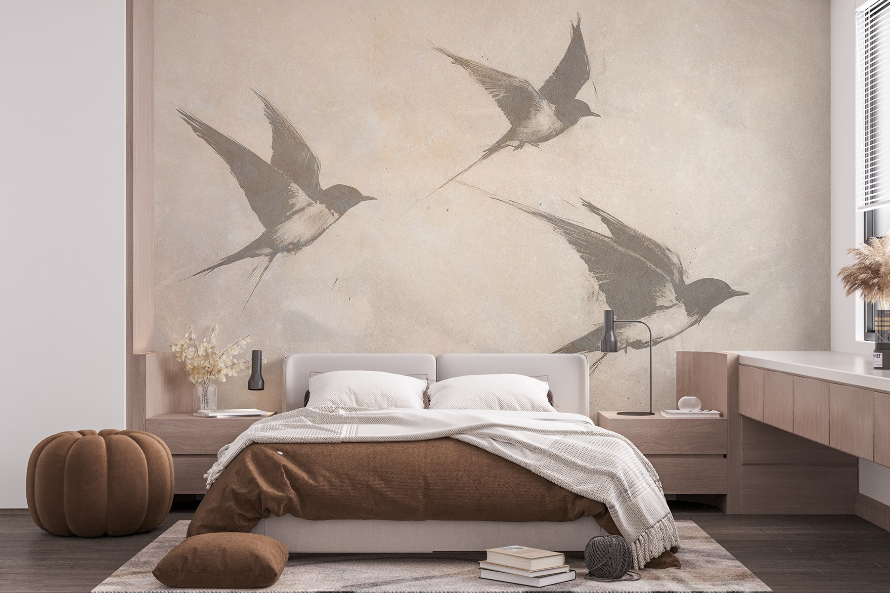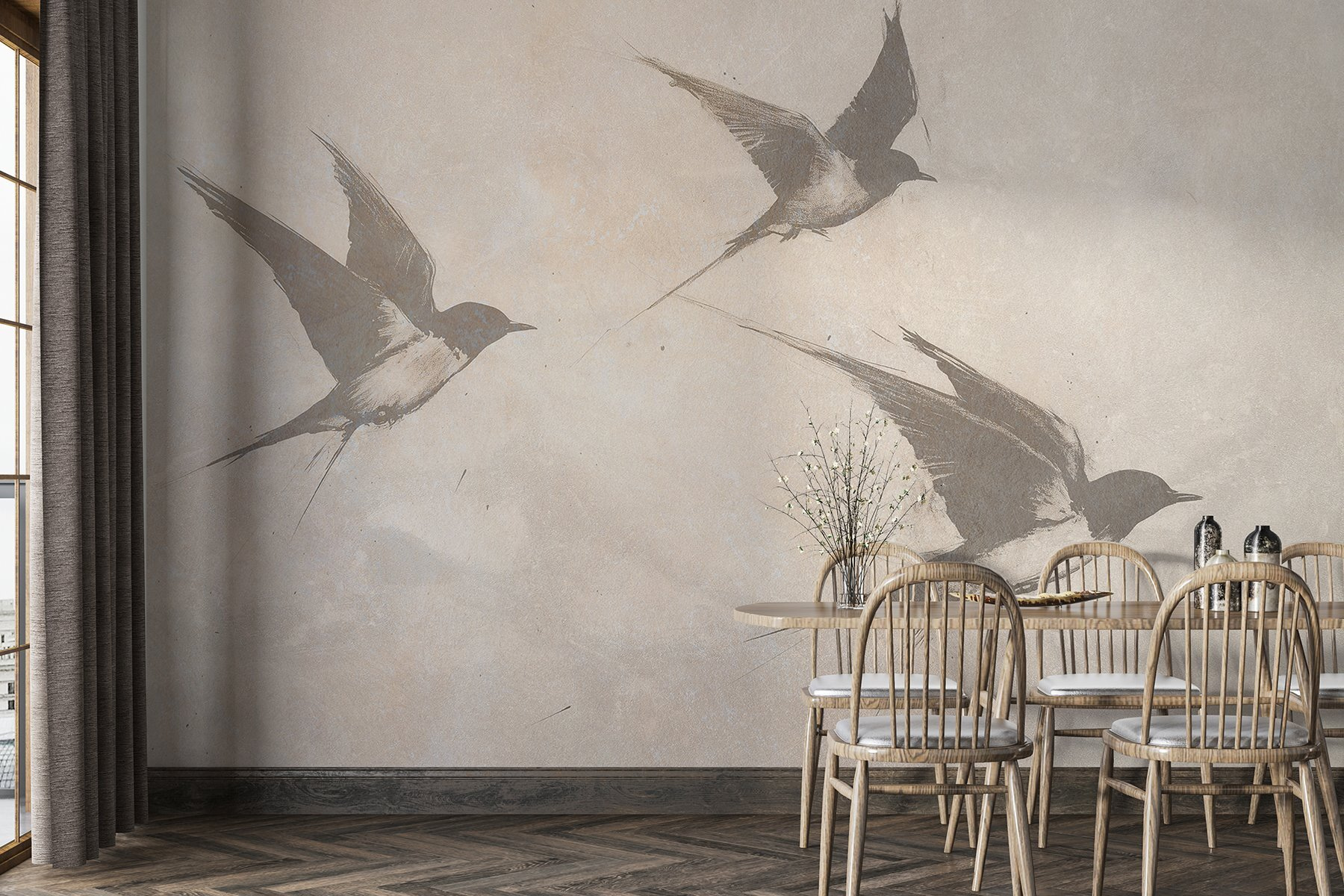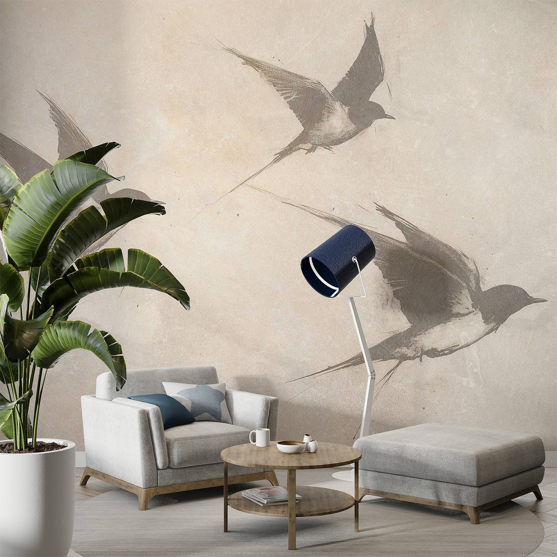Bármilyen teret alakítson át nyugodt meneküléssé ezzel a lenyűgöző, az égen szárnyaló madarakat ábrázoló falfestménnyel. A lágy színek és a finom vonalak nyugtató hangulatot árasztanak, amely tökéletes a nappaliba vagy egy hangulatos olvasósarokba. Képzelje csak el, hogy egy jó könyvvel kucorog, miközben a képzeletbeli szárnyak szelíd suttogása vezeti gondolatait. Olyan, mintha a természet egy darabja lenne a falon, amely nyugalomra és szabadságérzetre hív. Akár távoli helyekről ábrándozik, akár csak mosolyt csal az arcára, ez a falfestmény gyönyörű kiegészítője. Ki ne szeretné, ha néhány tollas barát egész nap vele lógna?