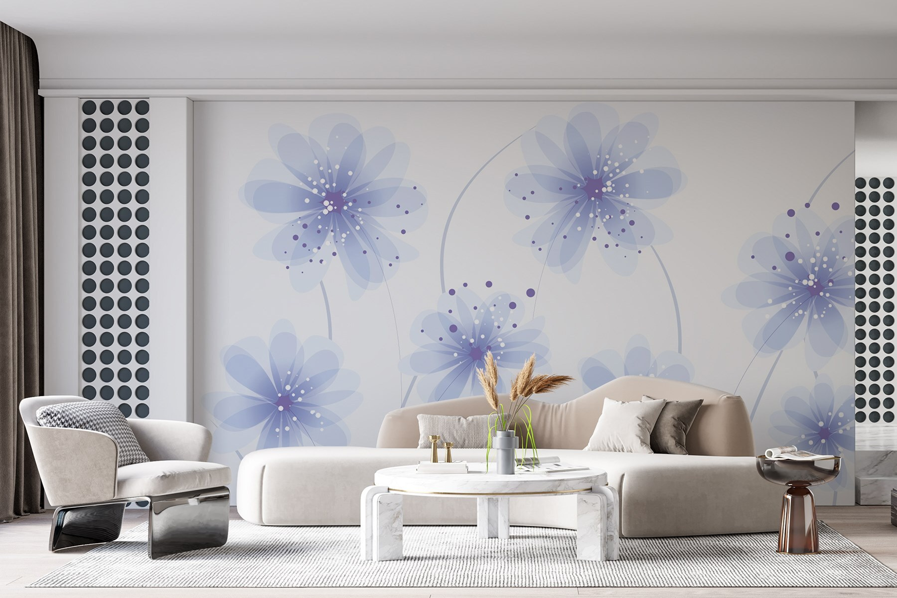 Alakítson át bármilyen helyiséget ezzel az elragadó “Kék virágokból álló fali falfestménycsoporttal”. Képzelje el: lágy szellő, a szirmok lágy zizegése és a levendula nyugtató árnyalatai táncolnak a falon. Olyan, mintha egy békés kert lenne a nappalidban! Minden egyes virág egy kis szeszélyt hoz, finom levendulafoltokkal és játékos pöttyökkel, amelyek pihentető és vidám érzést keltenek – mint a természet saját konfettije. Legyen szó egy hangulatos olvasósarokról vagy egy vibráló előszobáról, ez a falfestmény életet és fényt hoz. A barátok talán elkezdenek csodálkozni, hogy van-e titkos zöld hüvelykujjad!
