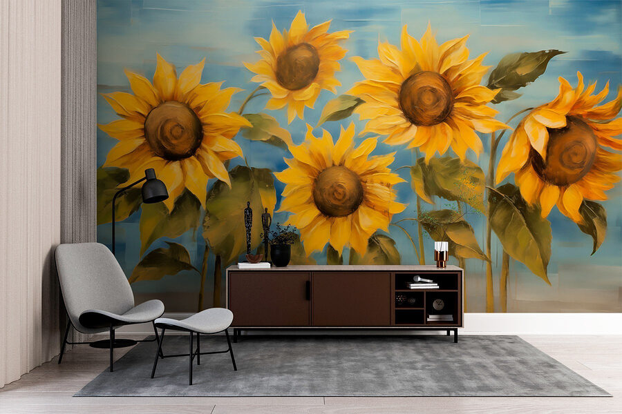 Dobja fel bármelyik szobát ezzel a lenyűgöző falfestménnyel, amelyen vidám napraforgók táncolnak a lágy kék ég alatt. Képzelje el, hogy egy hosszú nap után hazaérve csak az élénk sárga és meleg zöld színek fogadják, amelyek mintha örömöt kiáltanának. Olyan, mintha egy kis darab természet lenne a lakótérben. Akár egy hangulatos zugban, akár egy élénk gyülekezőhelyen, a falfestmény mosolyra és melegségre invitál. Képzelje el, ahogy a barátok beszélgetnek vagy a gyerekek játszanak, miközben ezek a kedves virágok őrködnek. Tökéletes módja annak, hogy színt vigyen a szobába, és behozza a természetet!
