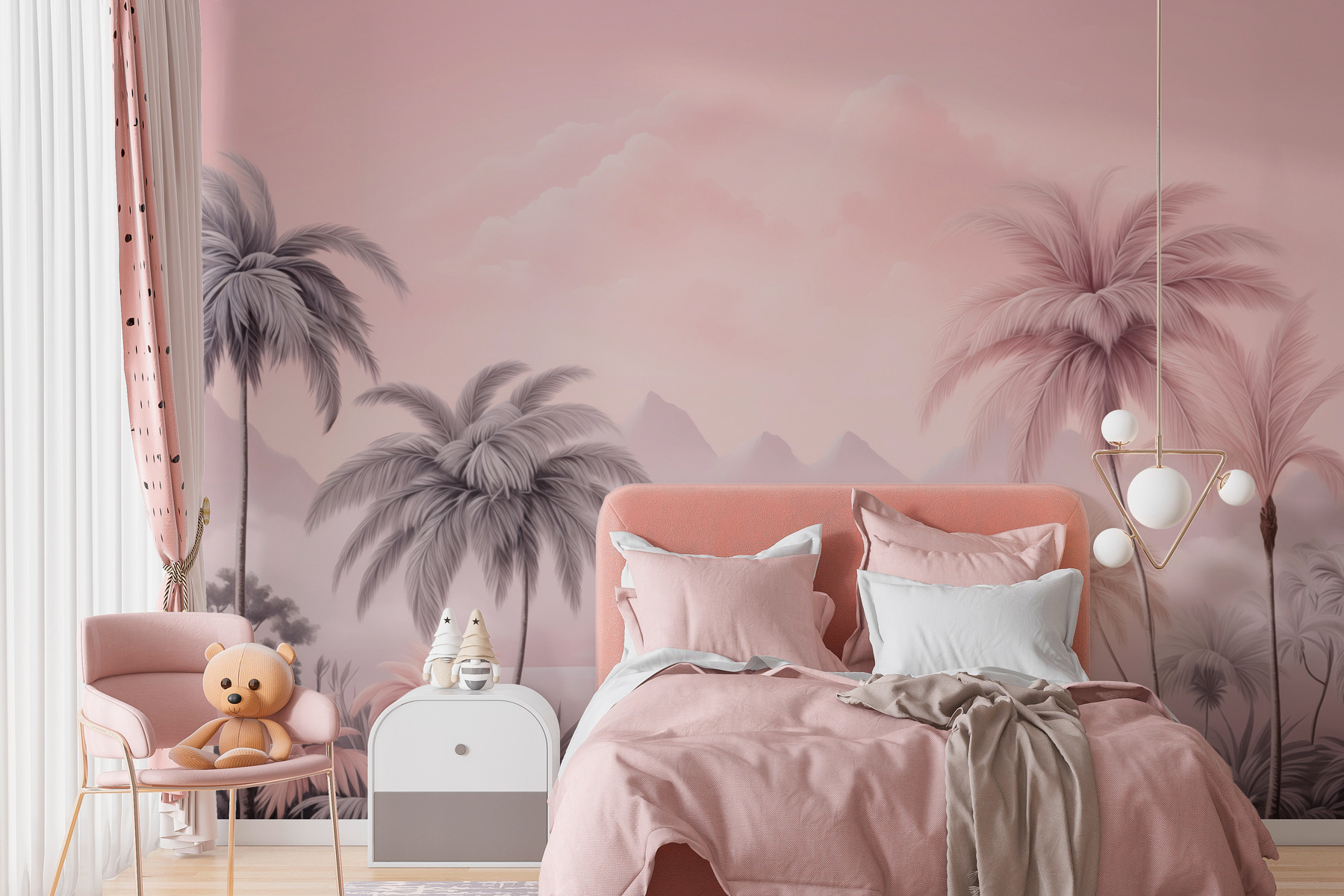 Alakítsa át terét nyugodt pihenőhellyé ezzel a lenyűgöző falfestménnyel, amelyen buja pálmafák és nyugodt hegyek láthatók. Képzelje el, ahogy kedvenc italát kortyolgatja, miközben a rózsaszín és a szürke szelíd árnyalatai beborítják, és minden napot nyaralásnak érezhet. Tökéletes a nyugodt hangulat megteremtéséhez – akár a nappaliban, akár abban a hangulatos olvasósarokban, amelyre vágysz! Ahogy a hegyek átbukkannak a pálmák között? Tiszta varázslat. Olyan, mintha a természetet behoznánk a házba, és egy-egy pillantással megnyugtatnánk a lelket. Ráadásul elég merész ahhoz, hogy beszélgetésindító legyen – ki ne csodálná ezt?