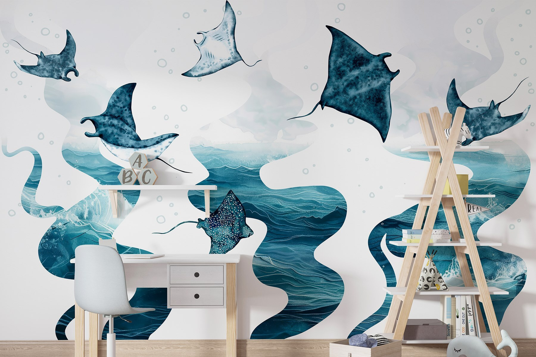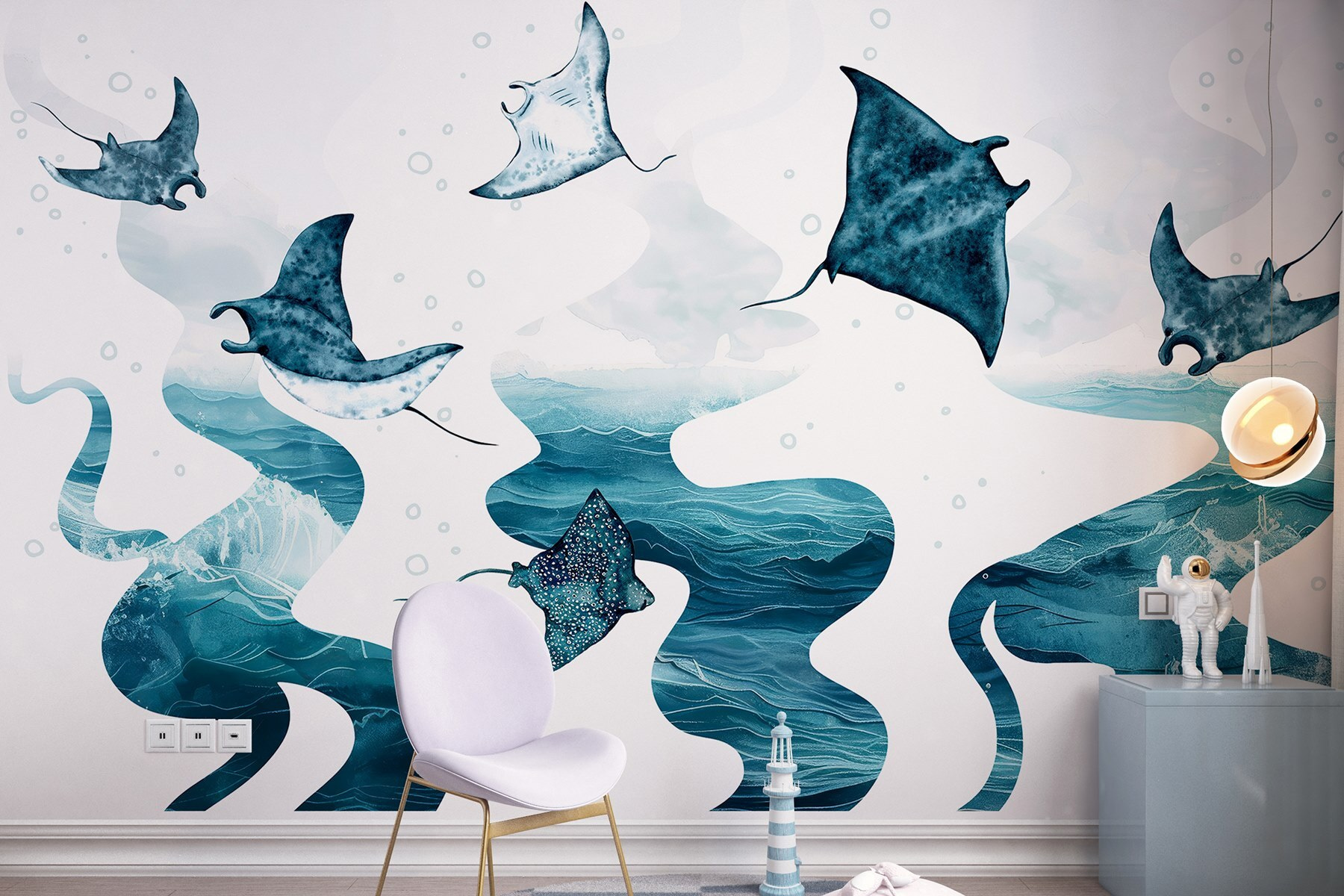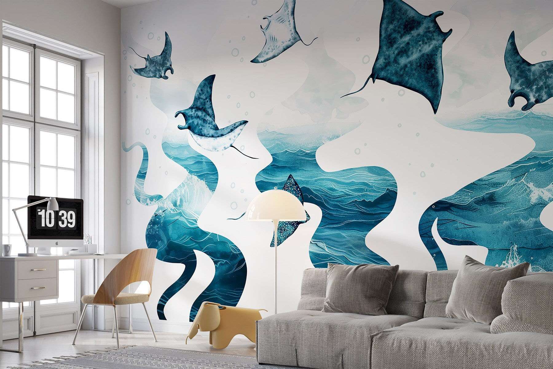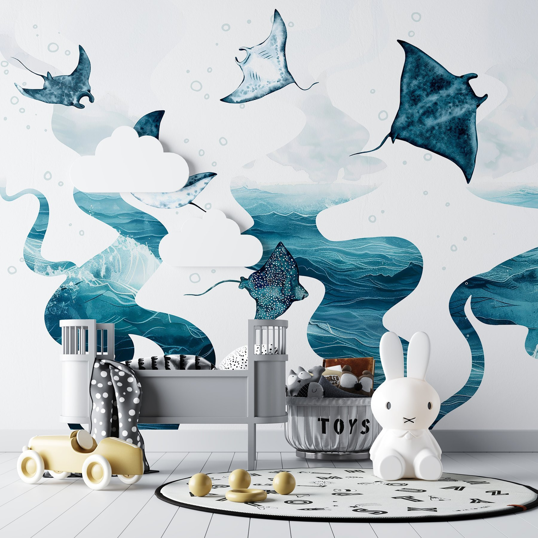 Bármilyen helyiséget alakítson át nyugodt víz alatti meneküléssé ezzel a lenyűgöző, a vízben kecsesen sikló rájákat ábrázoló falfestménnyel. Képzelje el, hogy belép egy olyan helyiségbe, ahol a nyugtató kék színek nyugodt hangulatot teremtenek, szinte olyan, mintha egy mini vakáción lenne otthon. A dizájn könnyed áramlása óceáni hullámokról és lágy szellőkről fog álmodni, így tökéletes egy tengerparti sarokba vagy egy nyugodt nappaliba. Ráadásul ki ne szeretné a rájákat? Olyanok, mint a tenger szelíd óriásai, amelyek egy csipetnyi csodát és személyiséget varázsolnak a falakra. Ez nem csupán dekoráció, hanem mindennapos emlékeztető a természet szépségére, amely finoman inspirálja a pihenést és a tengerparti szökésekről való ábrándozást. Merüljön el ebben a falfestményben, és engedje szabadon úszni a képzeletét!