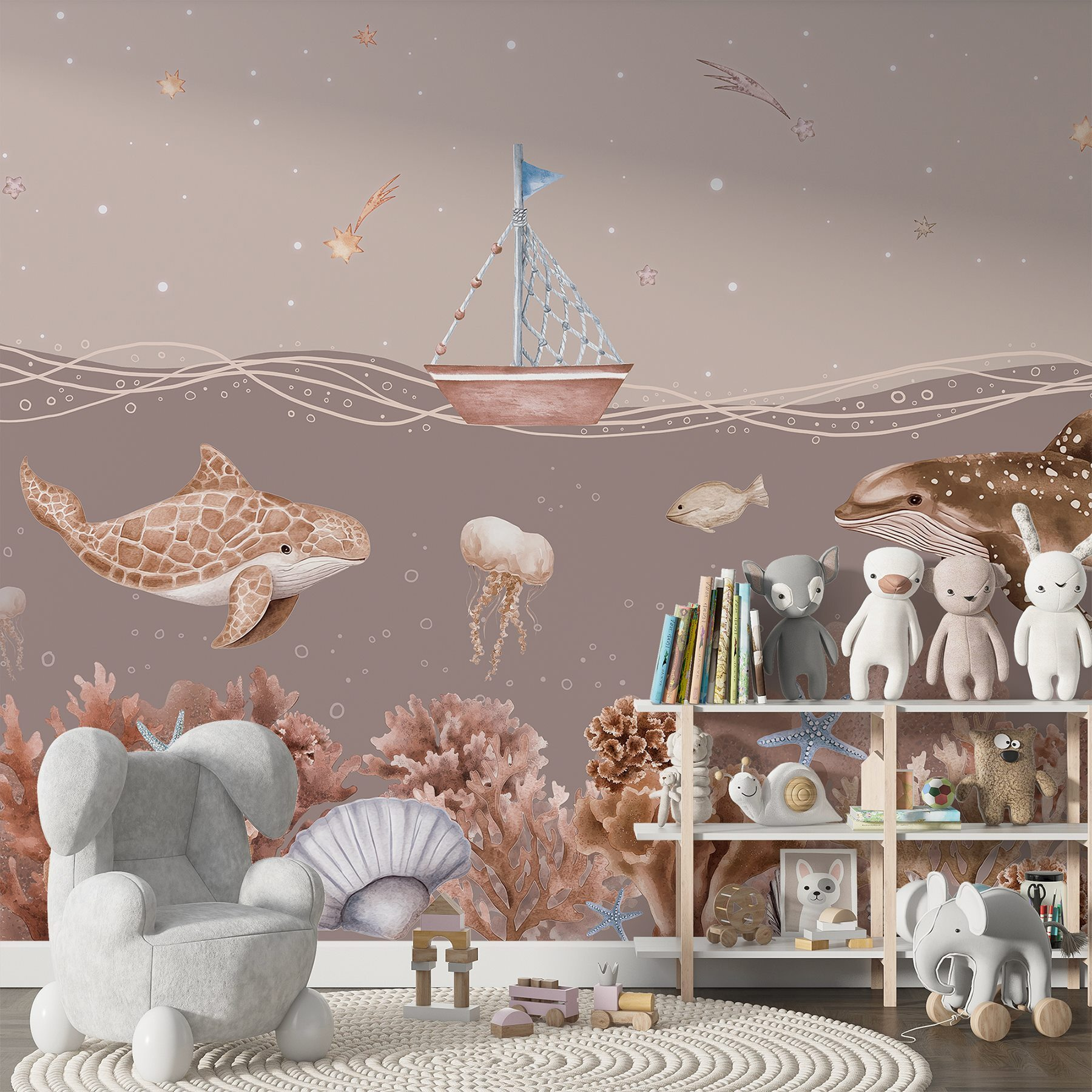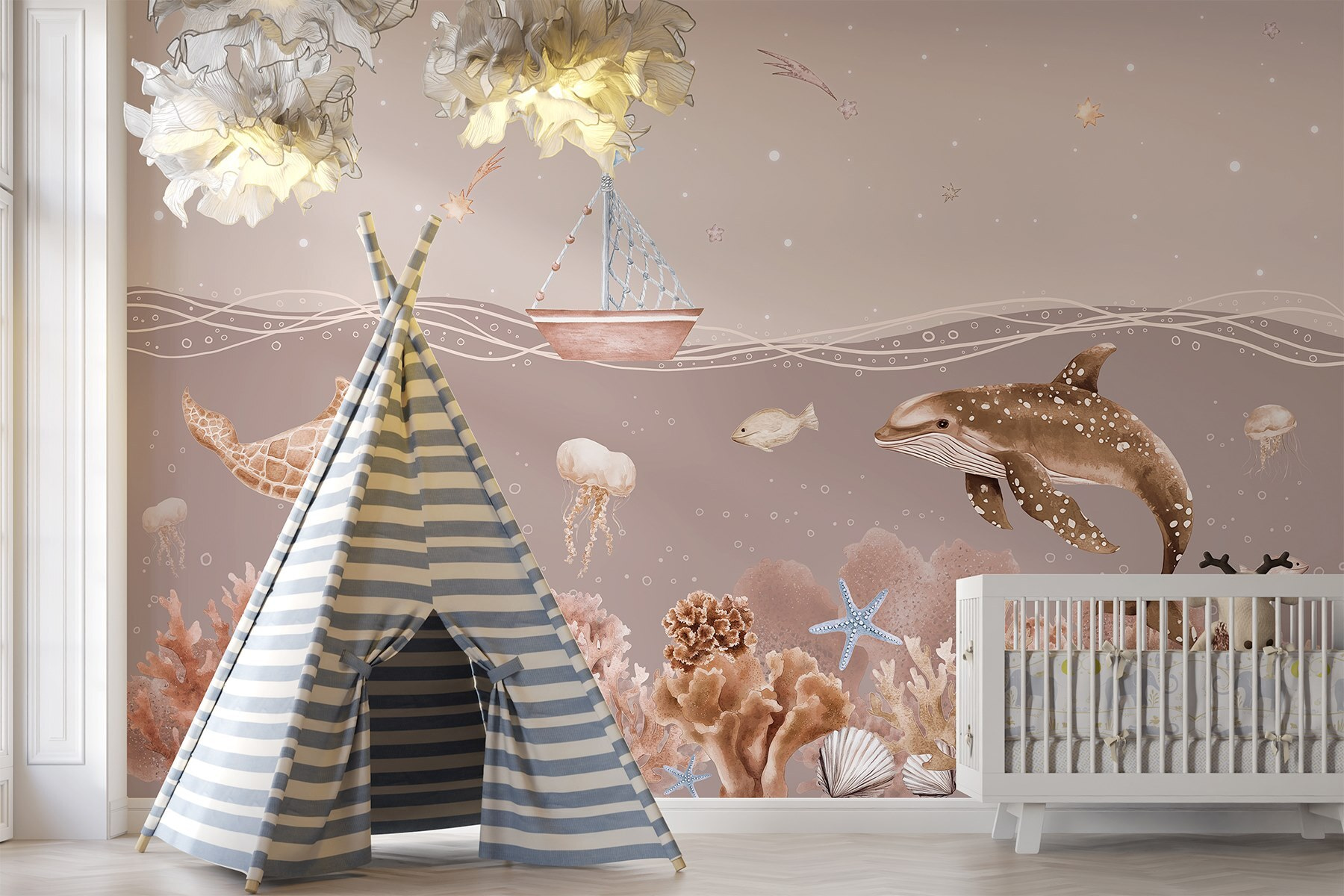 Merülj el a szeszélyes világba ezzel a lenyűgöző falfestménnyel, a “Tengeri élet csónakkal és halakkal” cíművel. Képzelje el: egy szelíd vitorlás hajó, amely a játékos tengeri élővilág felett billeg, és szinte élethűnek tűnik. Olyan, mintha egy titkos víz alatti kalandot látnál a nappalidban! Képzelje el, ahogy a gyerekek (vagy felnőttek!) víz alatti történeteket álmodnak, miközben a teknősöket, medúzákat és vibráló korallokat bámulják. Ez a falfestmény nyugodt, tengerparti hangulatot varázsol minden térbe, és vidámságot kölcsönöz. Tökéletes otthonokba, gyerekszobákba, vagy bárhová, ahol szükség van egy kis óceáni varázslatra. Ki ne mosolyogna ezen a vidám jeleneten?