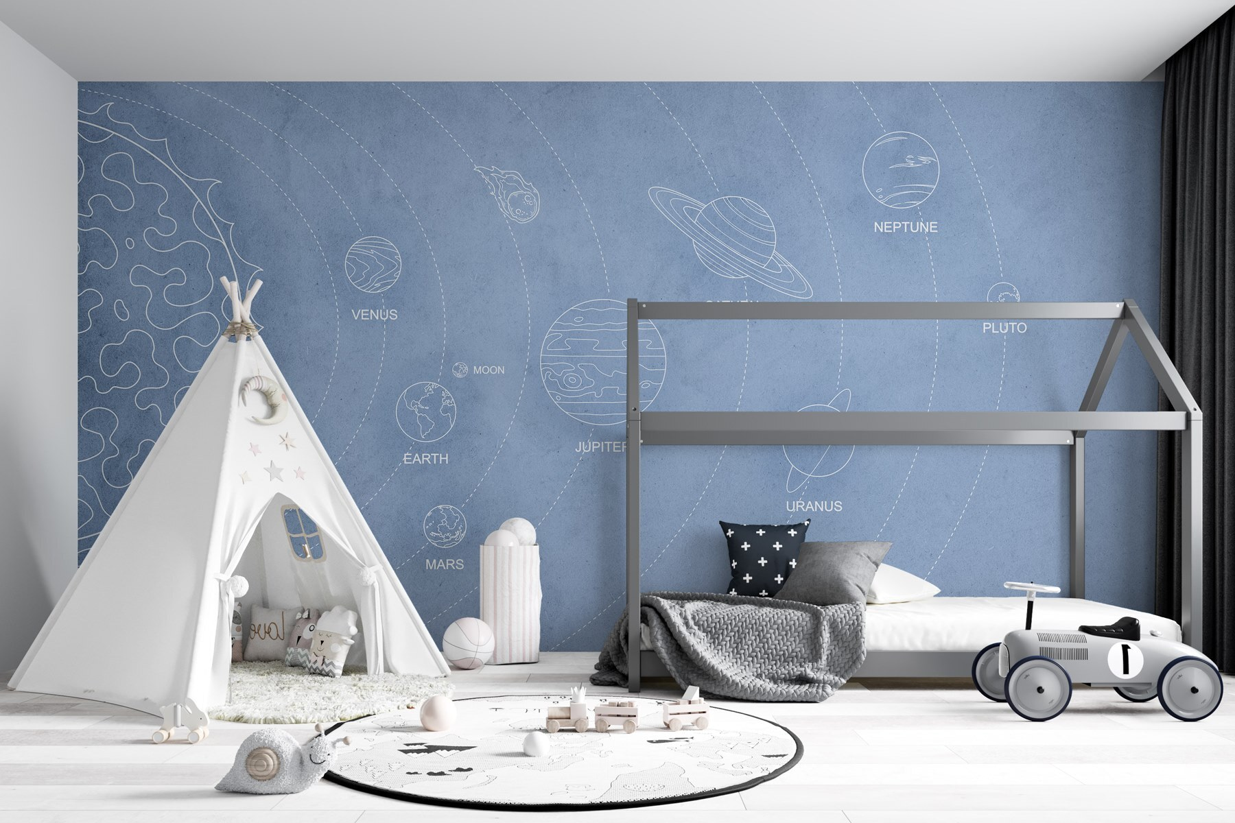 Változtasson bármilyen teret kozmikus csodavilággá ezzel a naprendszerünk bolygóit ábrázoló varázslatos falfestménnyel. Képzelje el, hogy minden nap a Merkúr, a Vénusz és még a Plútó lenyűgöző illusztrációjára ébred – igen, a Plútó is meghívást kapott a partira! A lágy kék háttér nyugalmat áraszt, míg a játékos grafika egy csipetnyi szeszélyt hoz. Tökéletes a gyerekszobákba vagy bárkihez, aki szereti a csillagokat. Kíváncsiságot ébreszt és elrepít egy másik világba, ahol a kalandok csak egy pillantásnyira vannak. Ez több mint dekoráció; ez egy napi adag inspiráció!