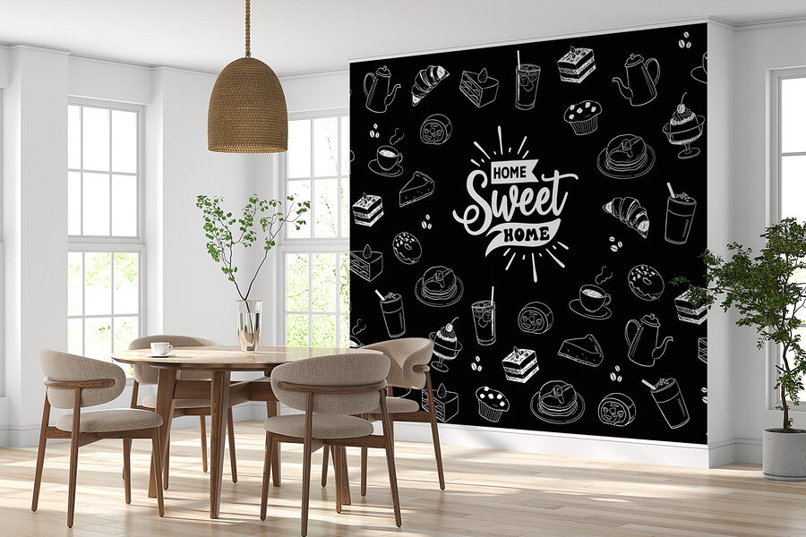 Alakítsa át terét ezzel a bájos, fekete-fehér falfestménnyel, amely élelmiszeralkalmazásokat ábrázol. Képzelje el, ahogyan a konyhájában kuckózik, és körülveszik a muffinok, kávéscsészék és sütemények játékos vázlatai. Olyan, mintha egy barátságos kis kávézó lenne a falon, amely kényeztetésre invitál. Ráadásul az “Otthon édes otthon” felirat szívet melengetően hat – mert ki ne szeretné, ha emlékeztetik a boldogságára? Ez a falfestmény tökéletes azok számára, akik értékelik a jó falatokat és a jó nevetést, és olyan szeszélyes hangulatot áraszt, amelyet minden nap élvezni fogsz. Ez egy dekoráció, amely ízletesen szól!