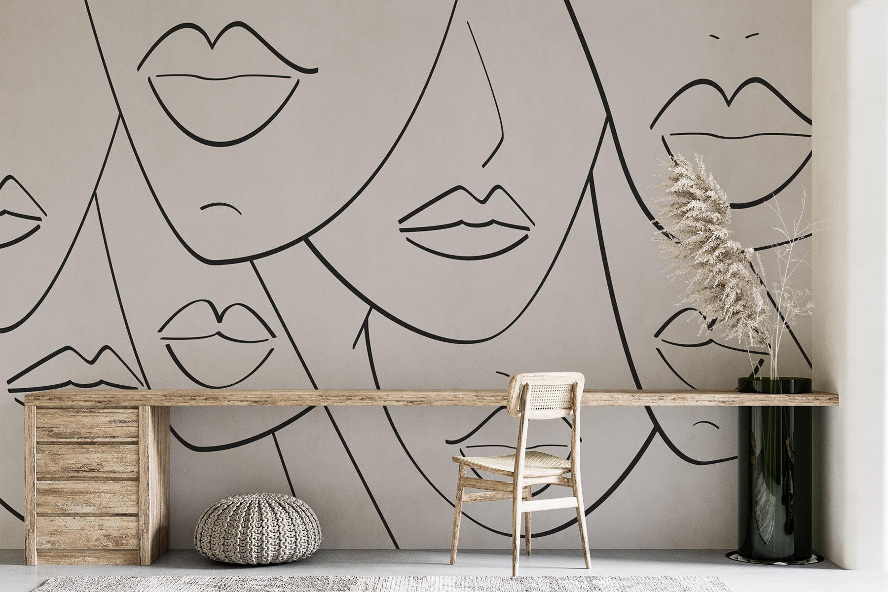 Alakítsa át terét ezzel a lenyűgöző falfestménnyel, amelyen absztrakt arcok csoportja látható, mindegyikük egyedi rajzolatú ajkával, feltűnő fekete-fehérben. Ez nem csak dekoráció; ez egy beszélgetésindító. Képzeld el, hogy belépsz egy szobába, és ezek az érdekes arckifejezések fogadnak, amelyek mindegyike más-más történetet mesél – milyen hangulatuk van, milyen titkokat rejtenek?