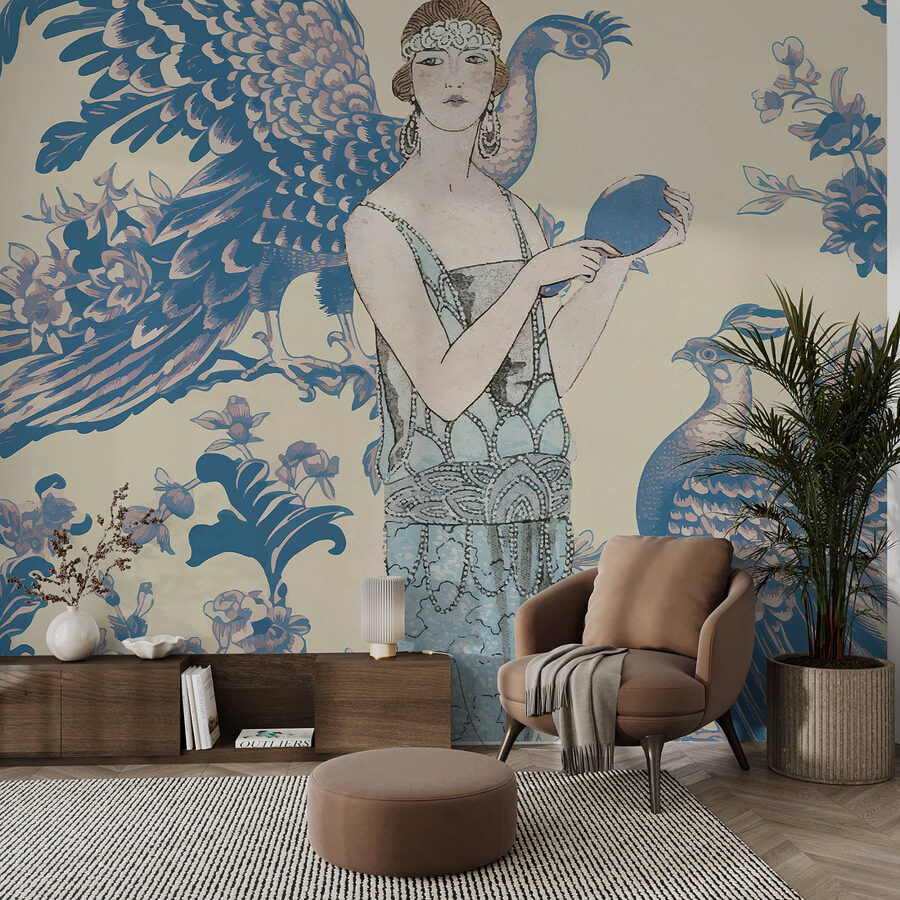 Dobja fel terét ezzel a lenyűgöző freskóval, amelyen egy kecses nő látható, aki egy kerek kék tárgyat tart a kezében, körülötte szeszélyes pávákkal és finom virágokkal. Olyan, mintha egy álomszép műalkotás lenne a faladon! Képzelje el, hogy minden nap a színek és az elegancia eme színfoltjára ébred – tökéletes a nyugodt hangulat megteremtéséhez. Akár egy hangulatos zugban, akár egy elegáns nappaliban, ez a falfestmény a szépség világába invitálja Önt. A vendégek nem fogják tudni megállni, hogy ne csodálják meg, és talán spontán beszélgetésre inspirál a művészetről, az utazásról vagy a megfoghatatlan pávákról – mert ki ne szeretné a csillogást?