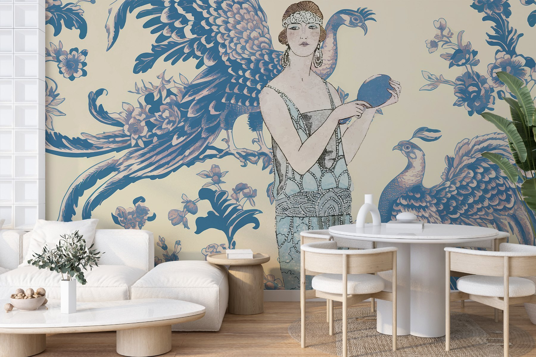 Dobja fel terét ezzel a lenyűgöző freskóval, amelyen egy kecses nő látható, aki egy kerek kék tárgyat tart a kezében, körülötte szeszélyes pávákkal és finom virágokkal. Olyan, mintha egy álomszép műalkotás lenne a faladon! Képzelje el, hogy minden nap a színek és az elegancia eme színfoltjára ébred – tökéletes a nyugodt hangulat megteremtéséhez. Akár egy hangulatos zugban, akár egy elegáns nappaliban, ez a falfestmény a szépség világába invitálja Önt. A vendégek nem fogják tudni megállni, hogy ne csodálják meg, és talán spontán beszélgetésre inspirál a művészetről, az utazásról vagy a megfoghatatlan pávákról – mert ki ne szeretné a csillogást?