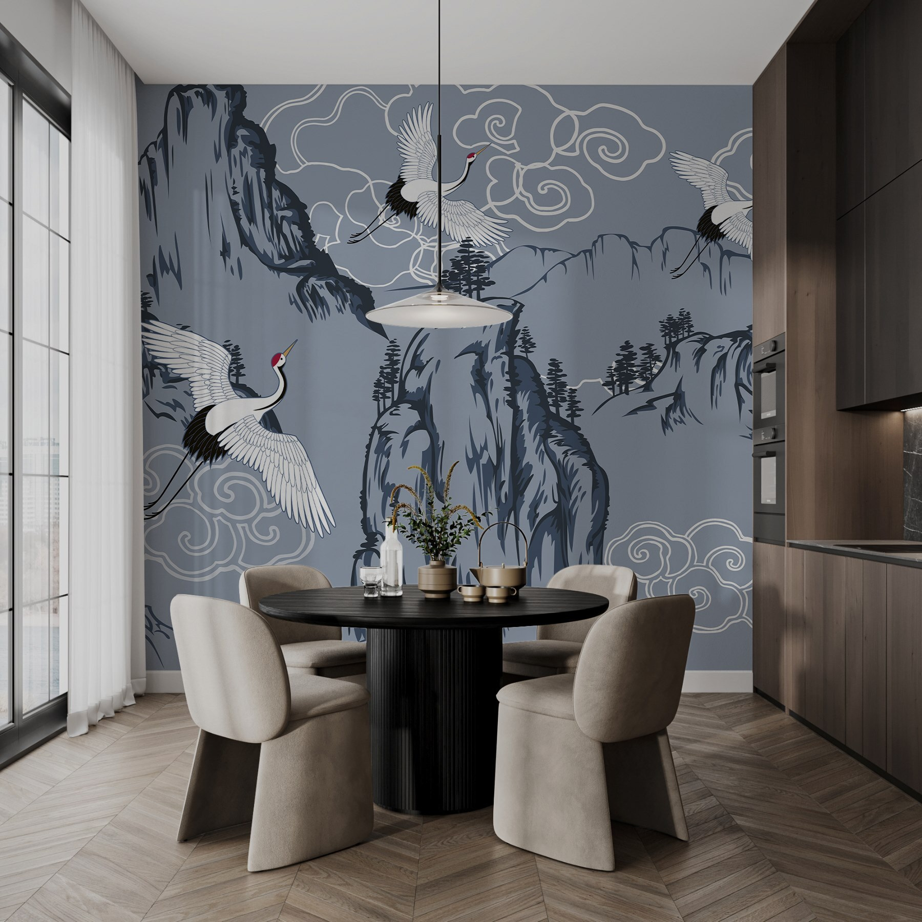 Alakítsa át terét egy nyugodt meneküléssé ezzel a lenyűgöző falfestménnyel, amelyen kecses madarak szállnak a fenséges hegyek fölé. Olyan, mintha egy kis természetet hozna be a lakásba, minden pollen nélkül. Képzelje el, hogy a reggeli kávéját kortyolgatva úgy érzi, mintha egy békés hegycsúcson lenne – a túrabakancsok nélkül. A lágy színek és a bonyolult részletek nyugodt hangulatot árasztanak, tökéletes egy hangulatos olvasósarokba vagy egy nyugodt hálószobába. Ráadásul remek beszélgetésindító! A vendégek kíváncsiak lesznek ezekre az elegáns darvakra, ön pedig készen áll majd a tökéletes történettel. Ez több mint egyszerű dekoráció; ez egy kis szelet zen a faladra. Frissítse fel szobáját, és hagyja, hogy falai a természetről suttogjanak meséket!