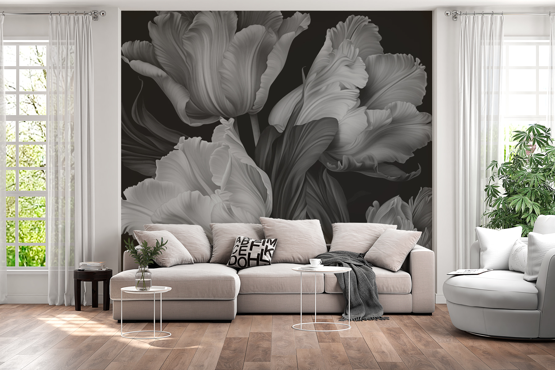 Alakítson át bármilyen helyiséget ezzel a lenyűgöző falfestménnyel, amelyen elegáns tulipánok láthatók monokróm tónusokban. Olyan, mintha egy képzőművészeti alkotás lenne a falon, múzeumi belépődíj nélkül. Képzelje el, hogy egy meleg itallal bújik össze, miközben ezeket a kecsesen ringatózó tulipánokat bámulja – annyira megnyugtató, mégis feltűnő. A fekete és a fehér kontrasztja egy kis drámaiságot kölcsönöz, tökéletes azokhoz a szeszélyes napokhoz, amikor csak be akarsz húzódni. A vendégek talán még meg is állnak, és megbabonázva azon tűnődnek, hogy vajon egy virágos csodavilágba léptek-e. Az egész egyszerűsége üdítően elegáns – ki ne szeretné ezt? Ez a falfestmény bájos, kifinomult és egy csipetnyi szeszélyes. Ez egy olyan falikép, amely kijelentést tesz.