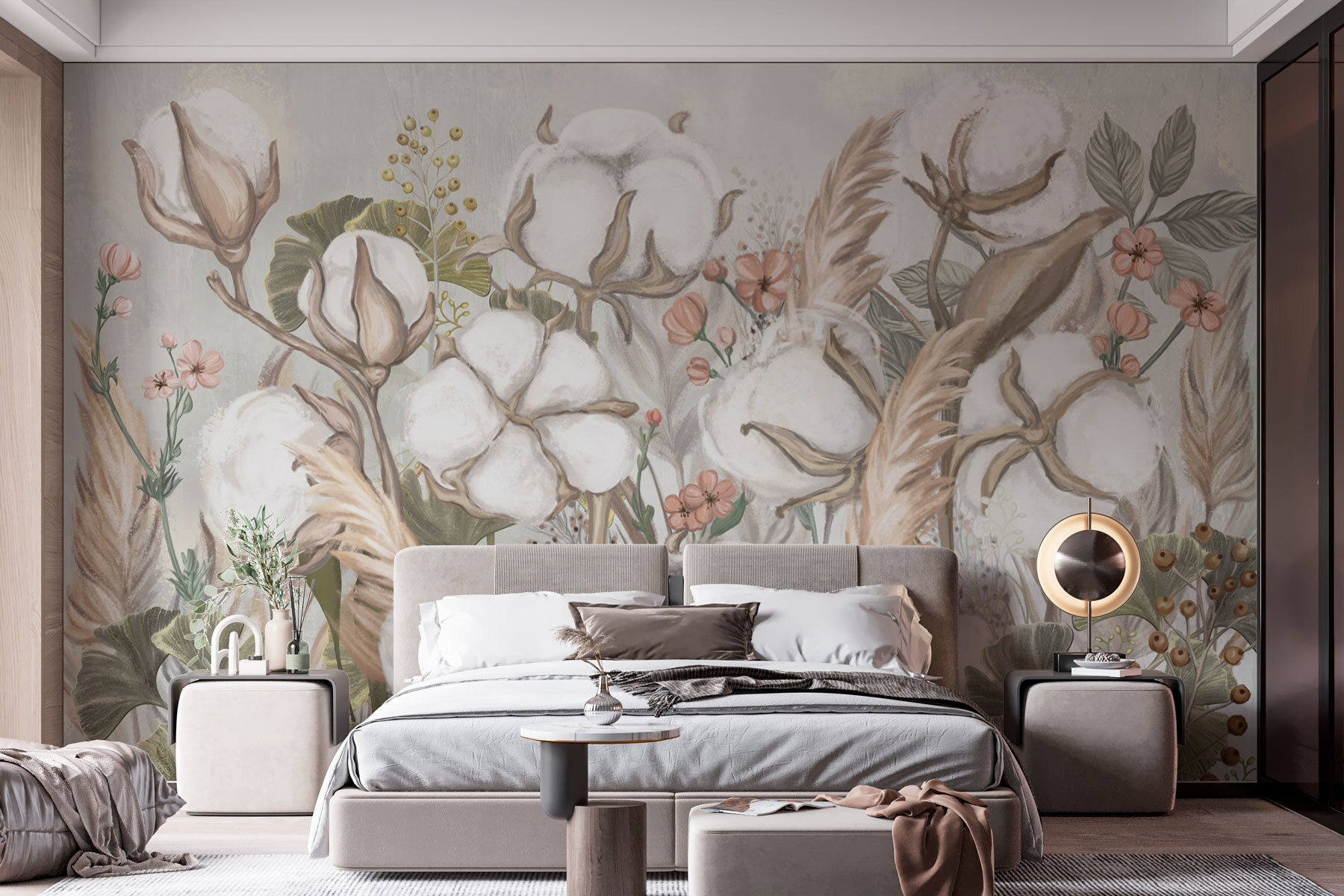Alakítsa át falait az álomszép “Fluffy Cotton Blooms in Soft Hues” (Puha pamutvirágok lágy árnyalatokban) falfestménnyel. Képzeld el, hogy egy nyugodt kertbe lépsz, ahol a pamutvirágok lágysága édes semmiségeket suttog. Ez a dizájn szelíd emlékeztető a természet szépségére, tökéletes a hangulatos hangulat megteremtéséhez. A finom zöldek és a meleg, semleges színek egész évben tavaszias érzést keltenek – ki ne szeretné ezt? Képzelje el egy gyerekszobában, vagy esetleg egy pihentető olvasósarokban. Hát nem érzed szinte a friss levegő illatát? Ez a falfestmény nem csak díszít, hanem megállásra, lélegzetvételre és a körülötted lévő szépség élvezésére hív. Hidd el, még a falad is hálás lesz érte!