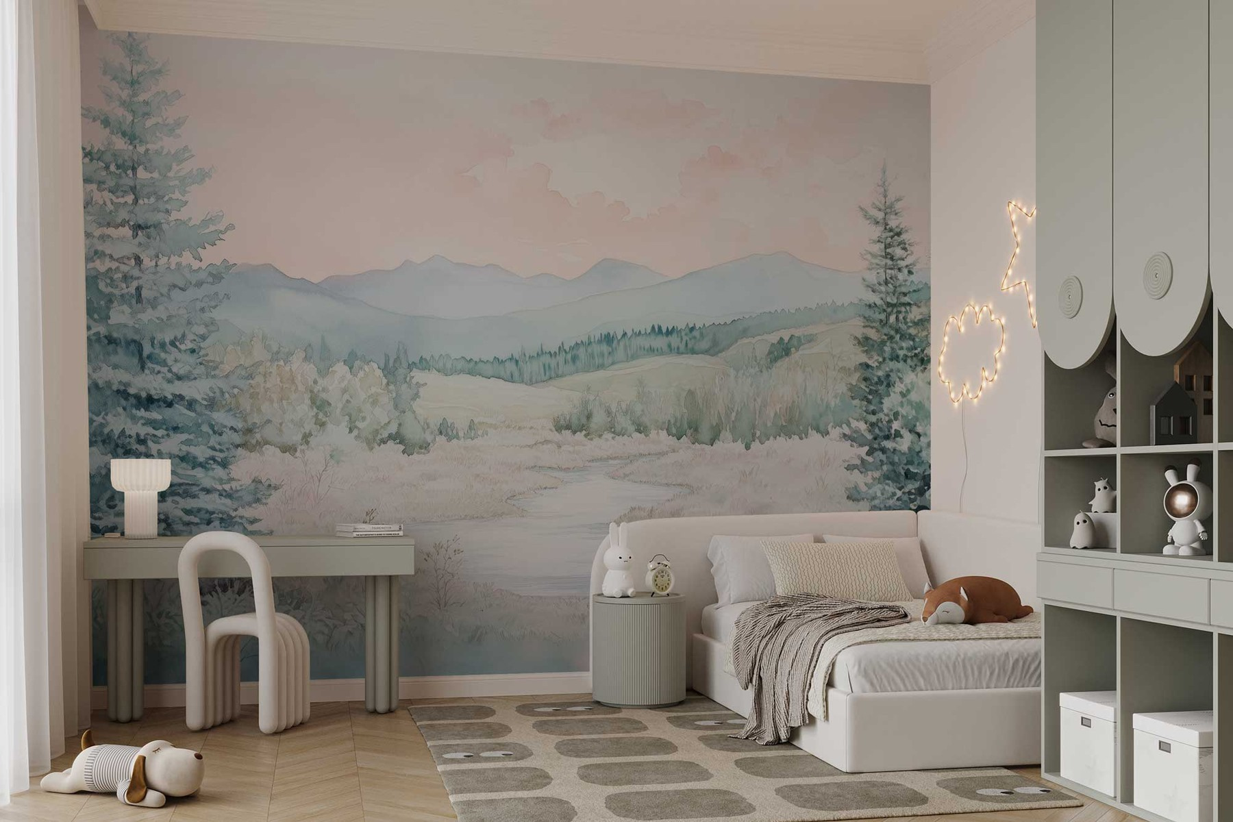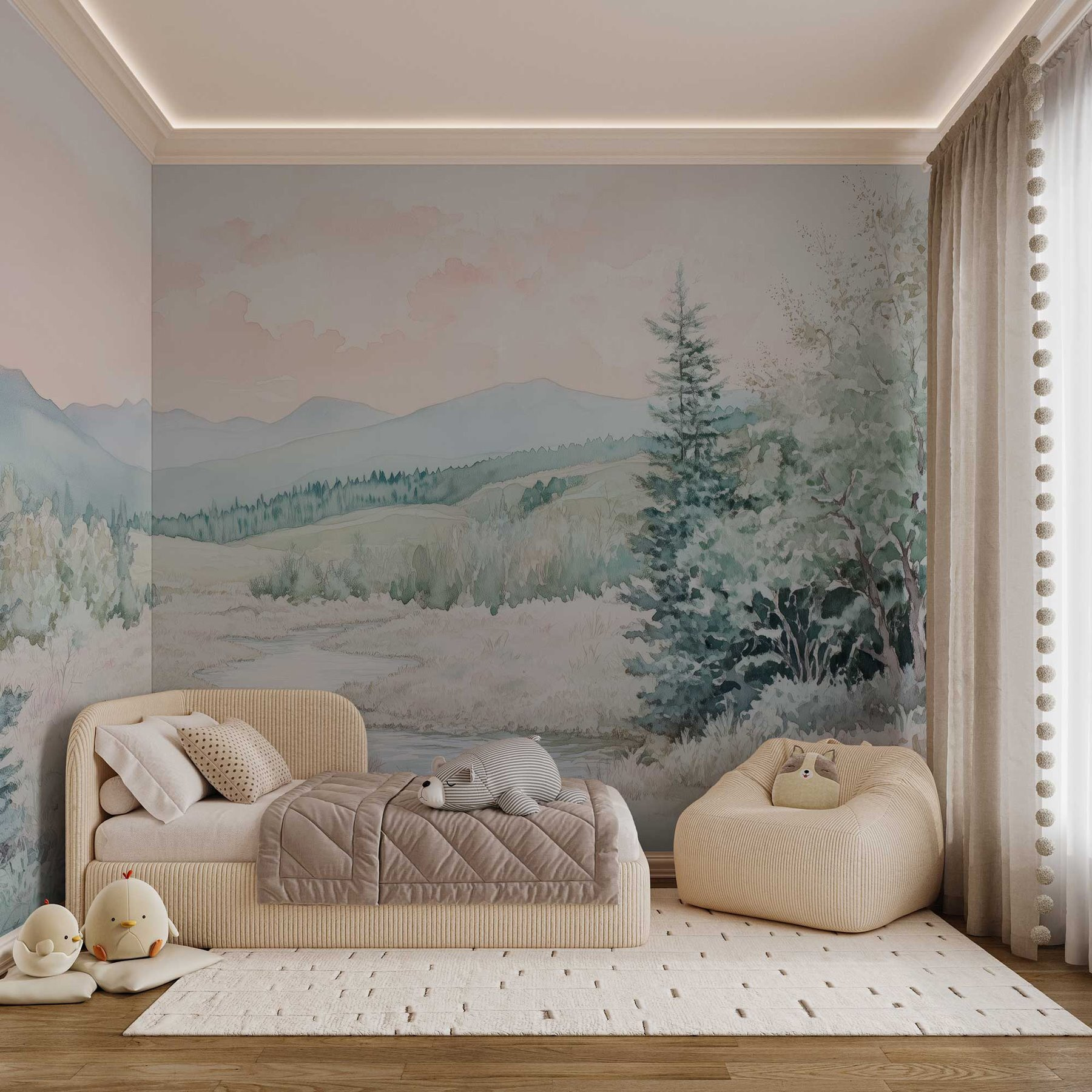 Alakítson át egy sima falat nyugodt meneküléssé ezzel a varázslatos akvarell falfestménnyel, amelyen egy buja völgyben kanyargó folyó látható. Ez a szépség lágy pasztellszíneket és gyengéd ecsetvonásokat ragad meg, így olyan, mint egy meghitt ölelés bármilyen térben. Képzelje el, ahogy a reggeli kávéját kortyolgatva ezt a békés jelenetet bámulja – olyan, mintha egy mini vakációt tartana otthon. Tökéletes hálószobákba vagy nappalikba, nyugtató hangulatot kölcsönöz, amely még a legnyüzsgőbb napokat is megnyugtatja. Ráadásul a természet szerelmesei is otthon fogják érezni magukat itt, fákkal és lenyűgöző hegyekkel körülvéve. Rajta – hozzon be egy kis természetet, és hagyja, hogy a falai a nyugalom történetét meséljék el!