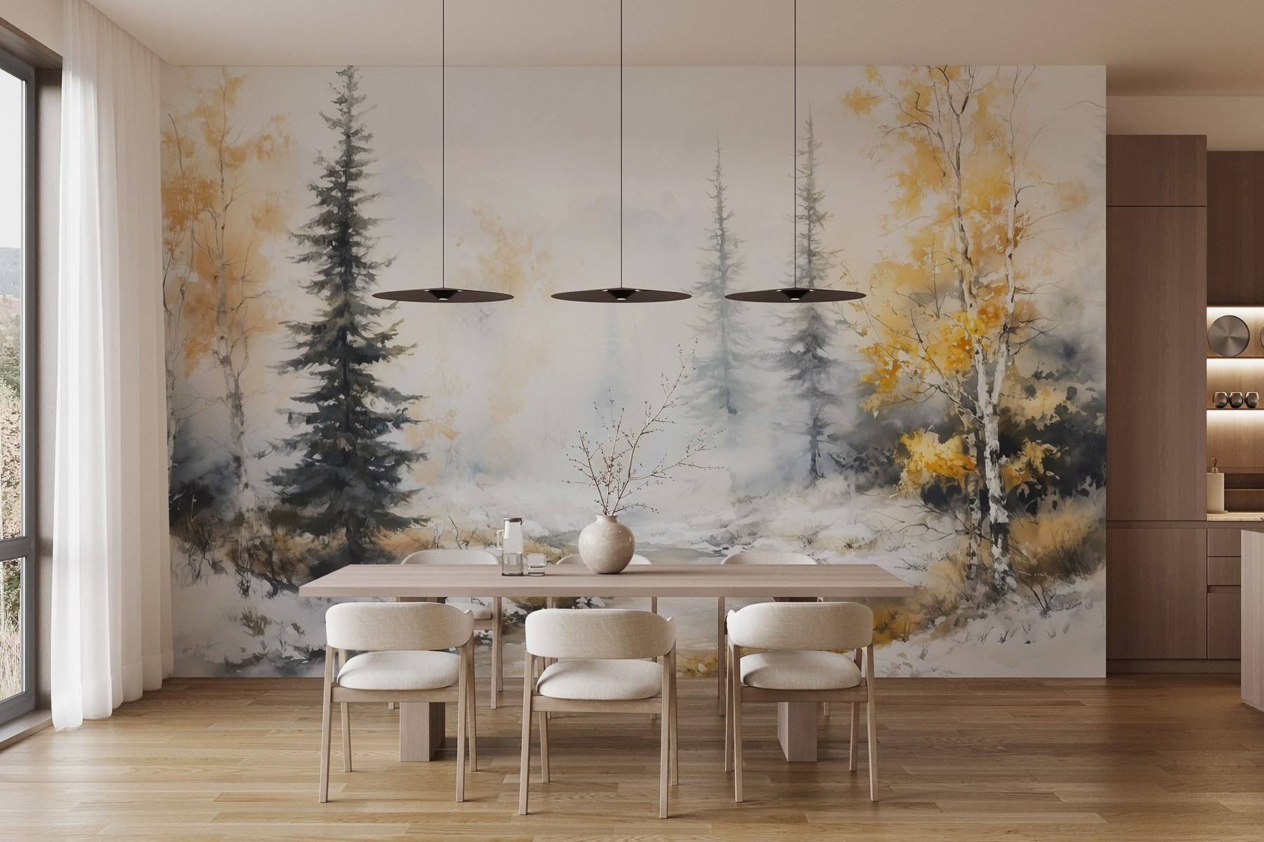 Alakítson át bármilyen helyiséget ezzel a lenyűgöző akvarell falfestménnyel, amelyen egy nyugodt folyó kanyarog egy havas tájban. Képzelje el, hogy belép a helyiségébe, és a természet szelíd suttogása fogadja, ahol a magas fák lágy szellőben táncolnak. A ködös tónusok nyugtató hangulatot teremtenek, amely tökéletes a hangulatos összejövetelekhez vagy egy jó könyvvel töltött csendes pillanatokhoz. Képzelje el egy csésze teát a kezében, otthonának melegét, amely ellentétben áll a kinti hűvös tájjal. Ez több mint dekoráció; olyan, mintha egy békés menedéket hozna be a házba. Csak vigyázzon – barátai megkérdezhetik, hogy egy erdei faházba költözött-e!