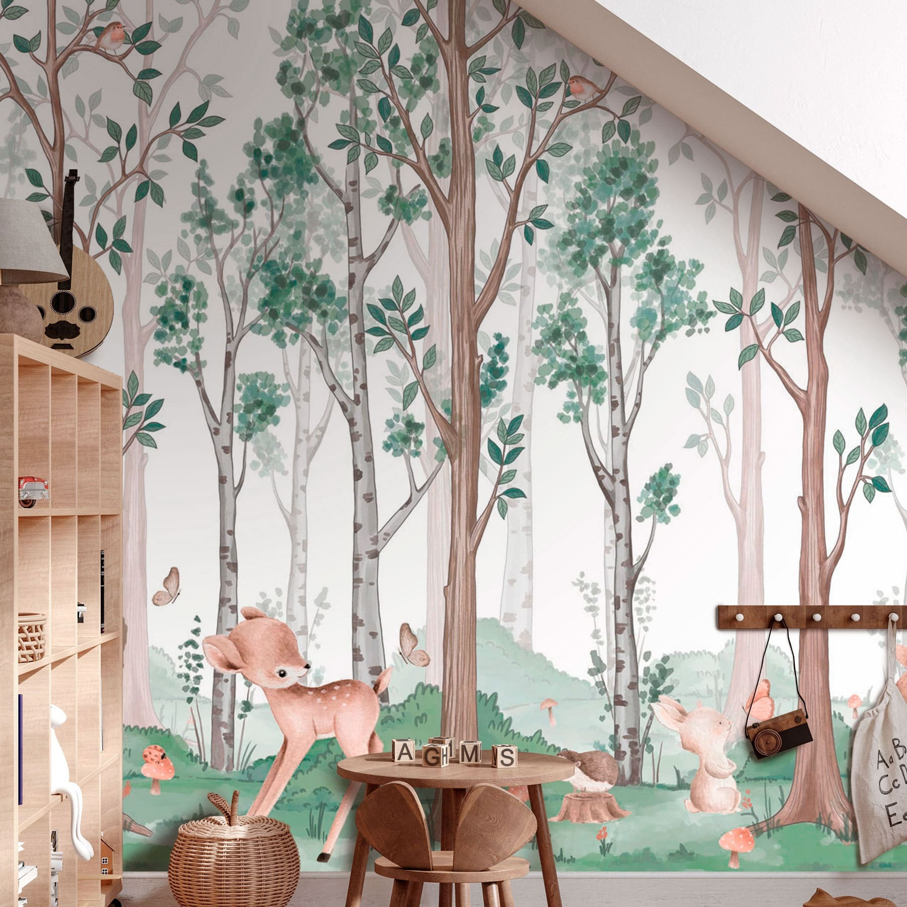 Alakítsa át falait egy nyugodt erdei meneküléssé ezzel a bájos falfestménnyel, amelyen játékos állatok és magas, suttogó fák láthatók. Képzeld el, ahogy a lágy szellő zizegeti a leveleket, miközben kíváncsi szarvasok és vidám nyuszik fedezik fel erdei otthonukat. A falfestmény lágy színeinek minden pillantása elrepíthet egy békés tisztásra, ahol minden gond eloszlik, mint a reggeli köd. Ideális egy hangulatos nappaliba vagy egy szeszélyes gyerekszobába, a természetet befelé hívja, örömöt és képzeletet ébresztve. Olyan, mintha egy kis darabka erdő lenne az otthonodban – persze a bogarak és a sár nélkül! Komolyan, lehet ennél hangulatosabb a dekoráció?