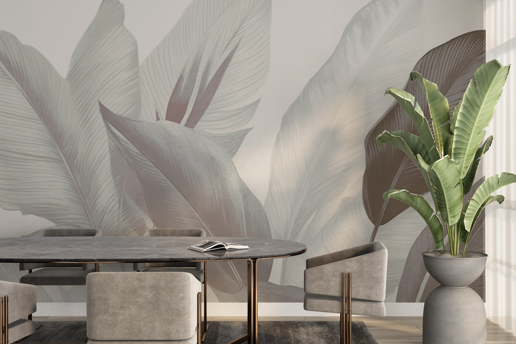 A “Soft Leaves in Gentle Tones” (Lágy levelek szelíd tónusokban) falfestmény segítségével bármelyik helyiséget nyugodttá varázsolhatja. Képzelje el: lusta délutánok teázgatással, a természet nyugtató ritmusától körülvéve – anélkül, hogy elhagyná a házat. A lágy árnyalatok és a finom lombok gyakorlatilag a pihenésről suttognak. Legyen szó egy hangulatos olvasósarokról vagy egy vibráló nappaliról, ez a falfestmény egy csipetnyi trópusi hangulatot kölcsönöz a kifinomultság és a melegség egyensúlyának. Olyan, mintha egy buja kertet hívnál a faladra. Képzelje csak el a beszélgetéseket és a nyugalmat, amit inspirálni fog. Ki ne szeretné ezt?