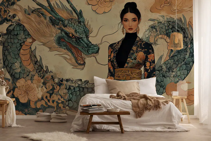 Alakítsa át terét ezzel a lenyűgöző falfestménnyel, amelyen egy kimonós nő és egy fenséges sárkány látható. Olyan, mintha a művészettörténet egy darabját hoznád be otthonodba, és ki ne szeretné ezt? A lágy akvarell árnyalatok könnyedén keverednek, és olyan hangulatot teremtenek, amely egyszerre megnyugtató és magával ragadó. Képzelje el, ahogy teát szürcsölgetve bámulja ezt a szépséget – mintha a sárkány mindjárt életre kelne, és csatlakozna a meghitt beszélgetéshez. Legyen szó akár nappaliról, irodáról vagy akár egy álomszép hálószobáról, ez a falfestmény megmozgatja a képzeletet. Melegségre hív és egyedi hangulatot kölcsönöz – tökéletes mindazoknak, akik szó nélkül akarnak nyilatkozni.