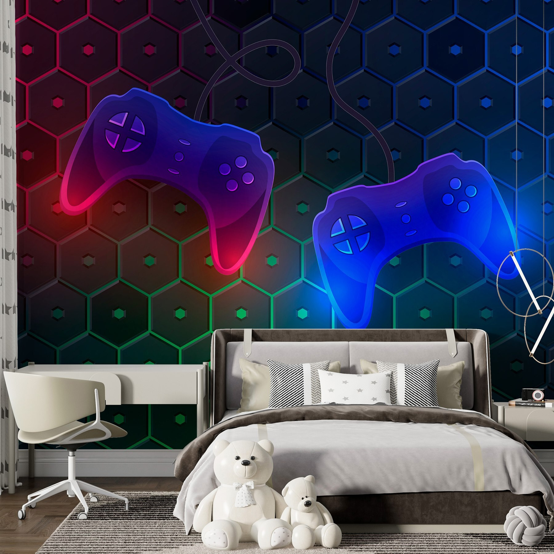 Alakítsd át a teret egy kis kreativitással! Ez a hatszögletű háttéren vibráló játékvezérlőket ábrázoló, elbűvölő falfestmény olyan, mint egy játékos meghívás, hogy merülj el a játékok világában. Képzeld el, ahogy a barátaiddal lógsz, és nevetés visszhangzik, miközben kihívjátok egymást, mindezt a színes kontrollerek fénye alatt. Ez nem csak dekoráció; ez egy hangulat – egy szórakoztató beszélgetésindító, amely energiát visz bármelyik szobába. A merész színek és a geometrikus minták keveréke modern csavart ad, amely frissen tartja a dolgokat. Tökéletes a játékosok barlangjába, gyerekszobákba, vagy bármely olyan helyiségbe, amely egy csipetnyi személyiségre vágyik. Minden alkalommal mosolyogni fogsz, amikor arra jársz – szinte olyan, mintha a falfestmény visszavágásra hívna!
