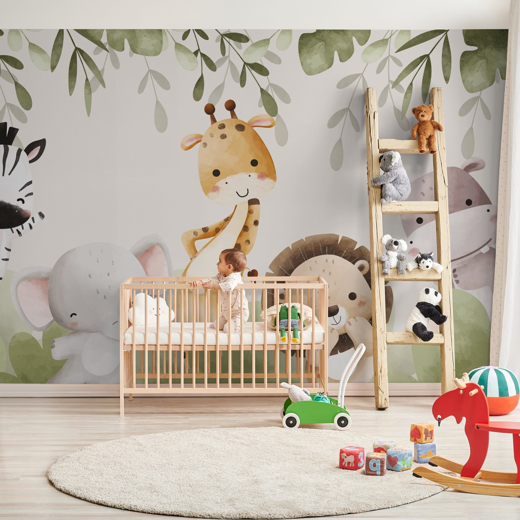 Dobja fel bármelyik szobát ezzel a bájos falfestménnyel, amelyen imádnivaló állatok játékos felvonulása látható, lombos lombkoronák alatt. Képzeld el, ahogy egy kíváncsi zsiráf pózol, miközben egy vidám elefánt táncol körülötte – milyen édes! Ez a szeszélyes jelenet melegséget és játékosságot sugároz, tökéletes egy gyerekszobába vagy egy hangulatos olvasósarokba. Úgy tűnik, minden egyes szereplőnek megvan a maga kis története, ami kreativitást és mosolyt vált ki. A szelíd színek és a barátságos arckifejezések nyugalmat árasztanak, és bármilyen teret mini dzsungelhellyé varázsolnak. Hidd el, minden alkalommal mosolyogni fogsz, amikor arra jársz!