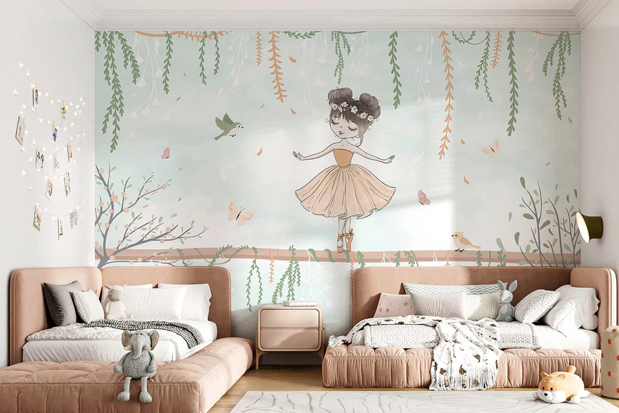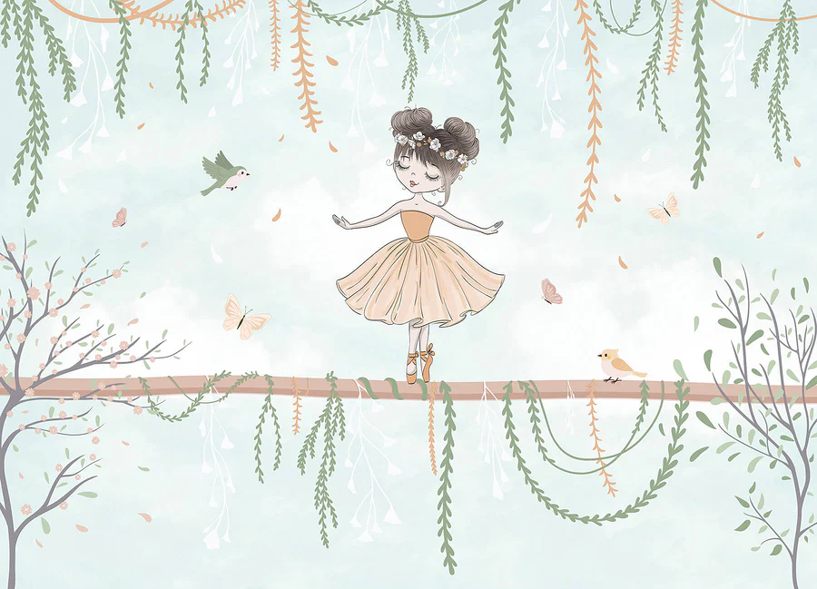 Imagine a whimsical escape right on your walls! This charming mural features a delightful girl dancing on a branch, surrounded by fluttering butterflies and curious birds. The soft pastel backdrop sets a serene tone, making any room feel like a dreamy forest retreat. It’s perfect for sparking little imaginations or simply adding a touch of magic to a nursery or playroom. Picture storytime turning into an adventure as kids gaze at this enchanting scene, completely lost in its sweetness. Seriously, who wouldn’t want to twirl happily along with her? A dash of joy for walls that call for a smile!