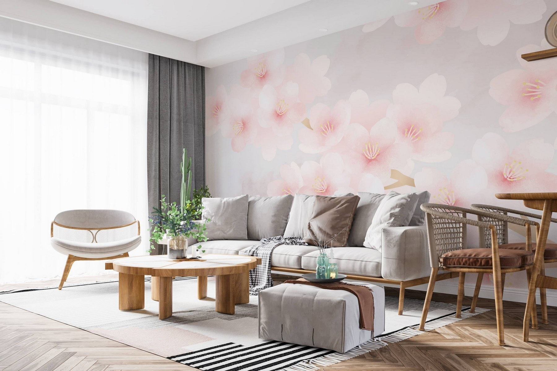 Transform your space into a serene escape with the “Delicate Blooms in Soft Pastels” wall mural. It’s like having a slice of a tranquil Japanese garden right in your living room! Those gentle pinks and soft whites whisper calming vibes, making you think of lazy afternoons sipping tea. Imagine friends walking in and pausing, admiring the dreamy blooms that look like they’ve just danced in a gentle breeze. Perfect for brightening up a cozy nook or making a statement in a more open area. It’s floral magic, minus the watering can and allergic sneezes!