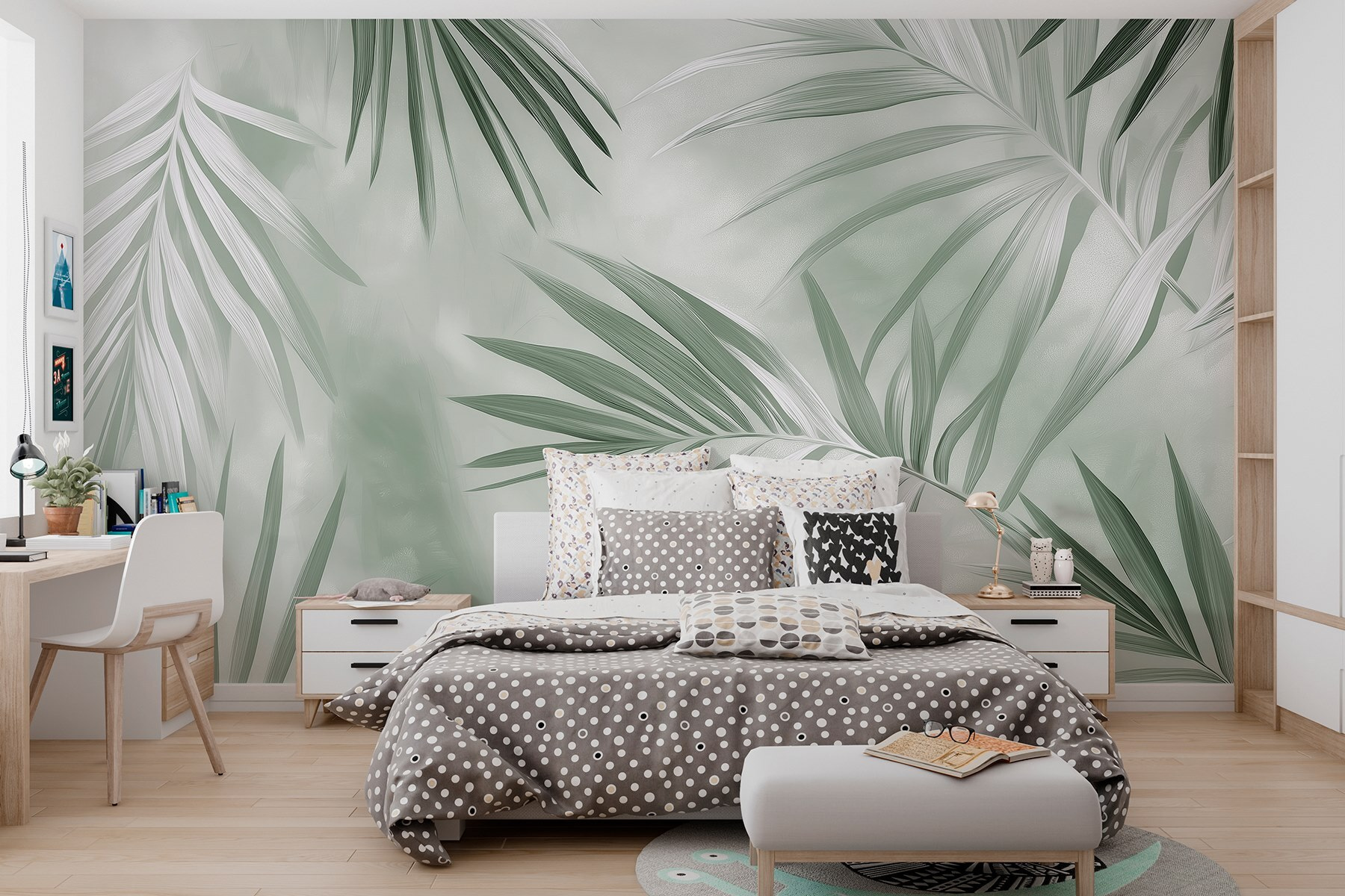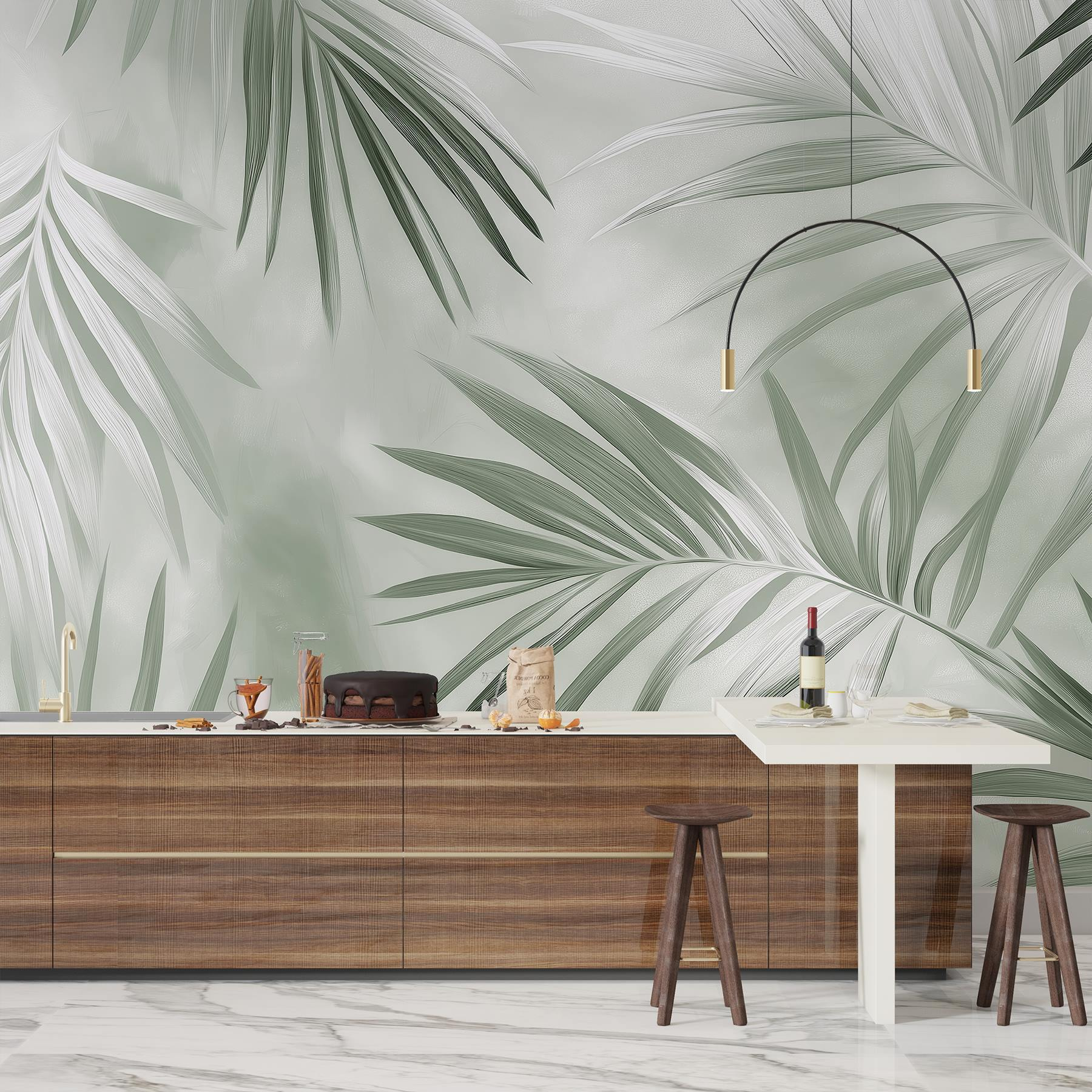 Bármelyik szobát buja menedékké varázsolhatja ezzel a „Nature’s Tranquil Green Foliage” (A természet nyugodt zöld lombjai) falfestménnyel. Képzelje el, hogy belép egy nyugodt dzsungelbe, ahol lágy zöldek táncolnak a falakon, és úgy érzi, mintha a természet veszi körül – még akkor is, ha csak a városra nyíló ablakból élvezheti a kilátást! A pálmalevelek finom vonalai pihenést sugároznak, ideálisak egy hangulatos sarok vagy egy nyugodt háttér kialakításához a jógaszőnyegéhez. Képzelje el a lustálkodós délutánokat egy jó könyvvel, egy csésze teával és a levegőben lebegő friss föld illatával. Mintha egy kis nyugodt paradicsomot hozna otthonába. Tökéletes azoknak, akik a beton dzsungelt egy kis botanikai boldogságra szeretnék cserélni. Nos, mit szól hozzá? Ideje felújítani a dolgokat!