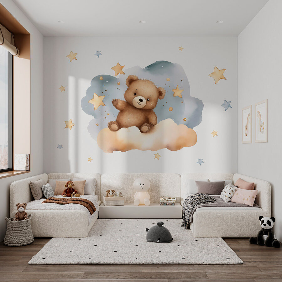 A „Teddy Bear on a Cloud” falfestménnyel bármilyen teret álomszerű csodaországgá varázsolhat! Képzelje el: egy bolyhos mackó fekszik egy felhőn, és integet, mintha épp most pillantotta volna meg Önt a szoba másik végéből. A lágy kék és szelíd sárga színek hangulatos, nyugodt légkört teremtenek – tökéletes választás egy gyerekszobához vagy játszószobához. Képzelje el, ahogy a kicsik felnéznek erre az imádnivaló jelenetre, és elalszanak, miközben bolyhos felhőkről és csillagos éjszakákról álmodnak. Ez a falfestmény nem csak aranyos, hanem melegséget és varázslatos hangulatot is áraszt a szobában. Mintha egy varázslatos barát lógna a falon, készen arra, hogy édes álmokat és végtelen mosolyokat varázsoljon! Ráadásul remek beszélgetésindító is – ki ne ájulna el egy ilyen elbűvölő kis mackótól?