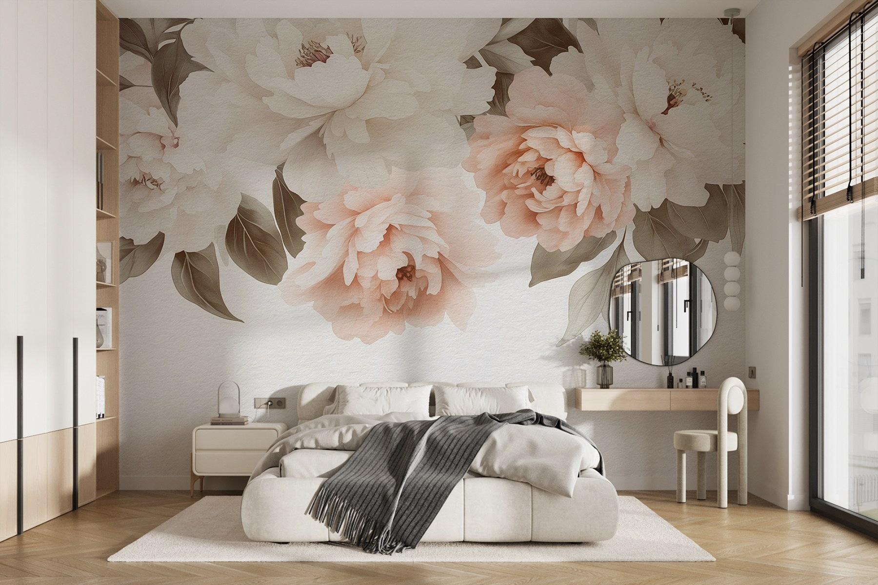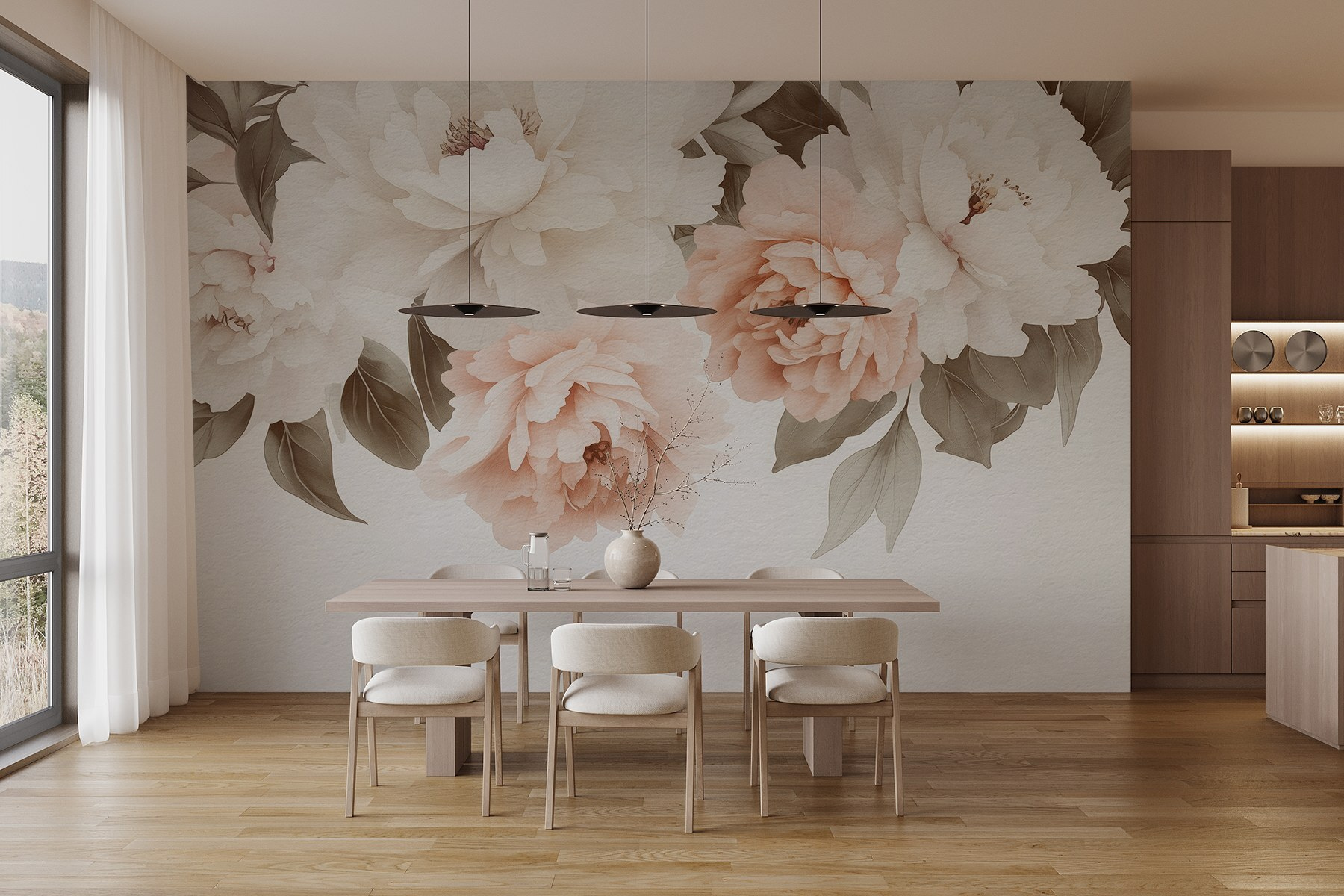 Bármelyik szobát alakítsd át nyugodt kerti pihenőhellyé ezzel a lenyűgöző falfestménnyel, amely egy álmodozó virág- és levélcsoportot ábrázol. Képzelje el, hogy minden reggel a bazsarózsák lágy pírjára ébred, lágy színeik melegséget és kényelmet sugároznak. Ez a falfestmény olyan, mintha egy kis természetet hozna be a házba, bájt és egy csipetnyi romantikát adva hozzá. Tökéletes hangulatos sarkokba, olvasósarkokba, vagy akár az üres falra, amely figyelemért könyörög. Nem csak dekoráció; hívogató légkört teremt, ahol az ember ellazulhat, mintha virágzó szirmok közé bújna. Ki ne érezné magát inspiráltnak egy ilyen szép térben?
