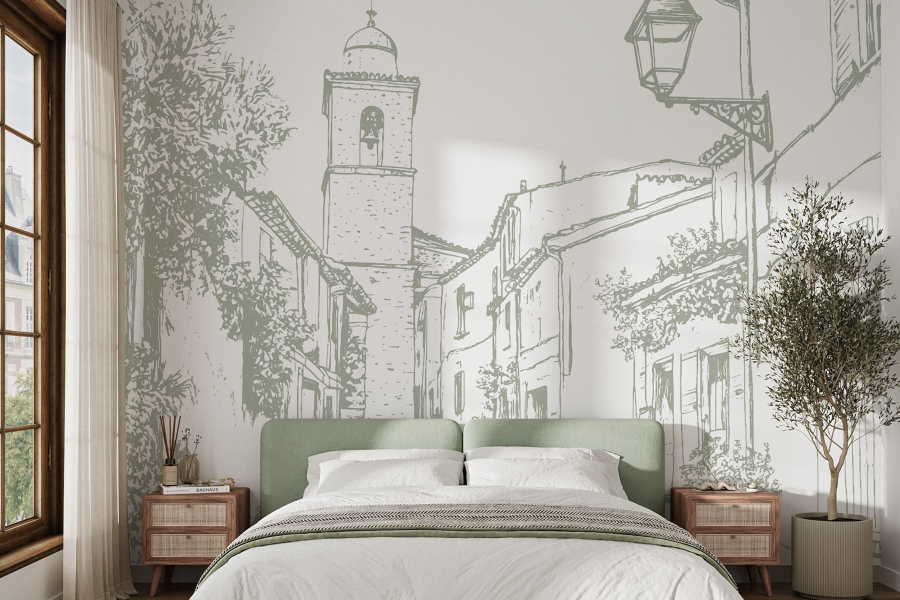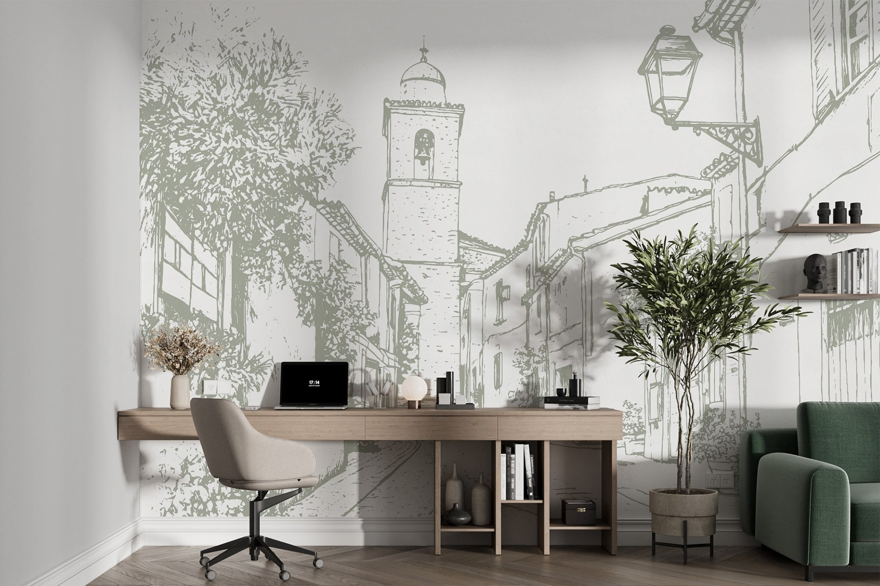 Alakítsa át terét ezzel a bájos falfestménnyel, amely egy festői utcát ábrázol, egy szép harangtoronnyal. Olyan, mintha egy nyugodt faluba lépnél be minden alkalommal, amikor arra jársz. Képzelje el, ahogy egy hangulatos zugban kávét szürcsölget, miközben falai békés hangulatot árasztanak. Az épületek lágy körvonalai és a buja zöld növényzet nyugalmat áraszt, amely tökéletes a hosszú nap utáni kikapcsolódáshoz. Ez a falfestmény megteremti az utazással és kalanddal kapcsolatos álmodozások színterét. Hagyja, hogy történetekre inspiráljon, és melegséget vigyen bármelyik szobába – mert ki ne szeretne egy csipetnyi szeszélyt az életébe?