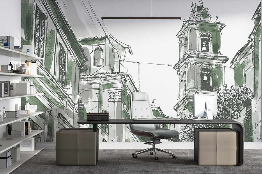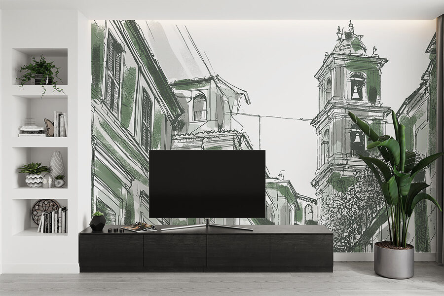Vigyen egy csipetnyi városi bájt a terébe ezzel a varázslatos falfestménnyel. Képzelje el: egy csengettyűkkel díszített épület magával ragadó rajza, amely a nyüzsgő városi élet történeteit suttogja. A lágy zöldek és a bonyolult vonalak arra invitálnak, hogy bepillantson egy nyugodt, mégis élénk utcaképbe, megmozgatva a képzeletet. Képzelje el, hogy kávét szürcsölgetve, ezt a freskót bámulva érzi, ahogy a közösség és a történelem melegsége körülveszi. Tökéletes nappaliba, kávézókba vagy hangulatos olvasósarokba, személyiséget kölcsönöz anélkül, hogy elnyomná a teret. Olyan, mintha egy kis darabka városi varázslatot tartanál otthonodban.