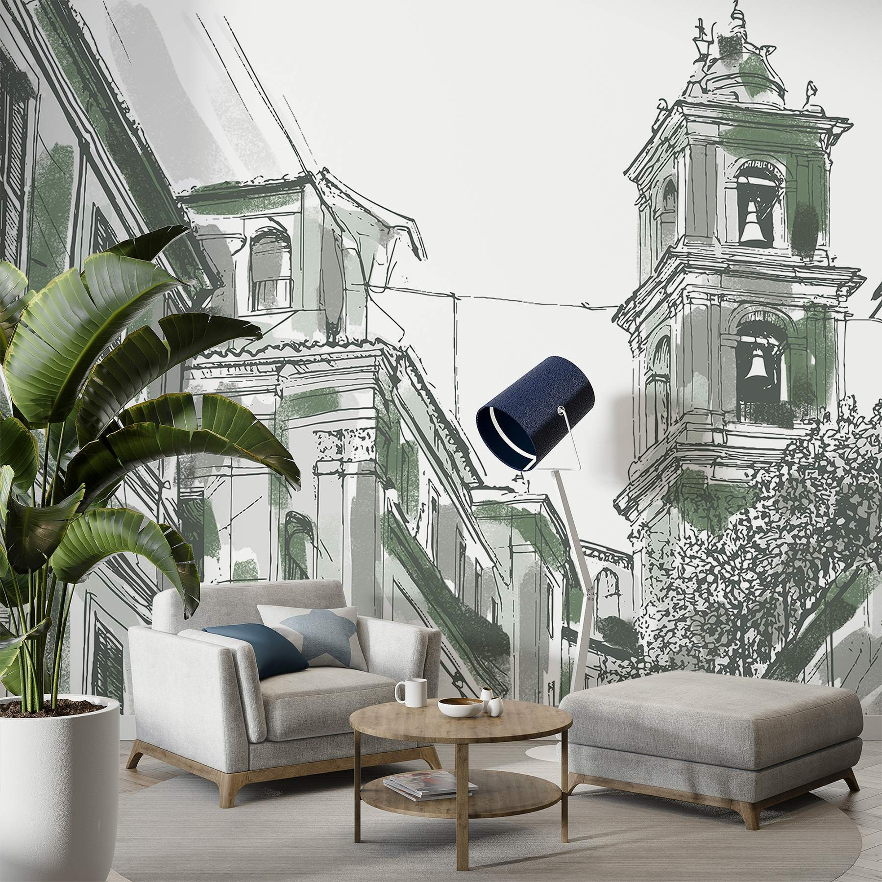 Vigyen egy csipetnyi városi bájt a terébe ezzel a varázslatos falfestménnyel. Képzelje el: egy csengettyűkkel díszített épület magával ragadó rajza, amely a nyüzsgő városi élet történeteit suttogja. A lágy zöldek és a bonyolult vonalak arra invitálnak, hogy bepillantson egy nyugodt, mégis élénk utcaképbe, megmozgatva a képzeletet. Képzelje el, hogy kávét szürcsölgetve, ezt a freskót bámulva érzi, ahogy a közösség és a történelem melegsége körülveszi. Tökéletes nappaliba, kávézókba vagy hangulatos olvasósarokba, személyiséget kölcsönöz anélkül, hogy elnyomná a teret. Olyan, mintha egy kis darabka városi varázslatot tartanál otthonodban.