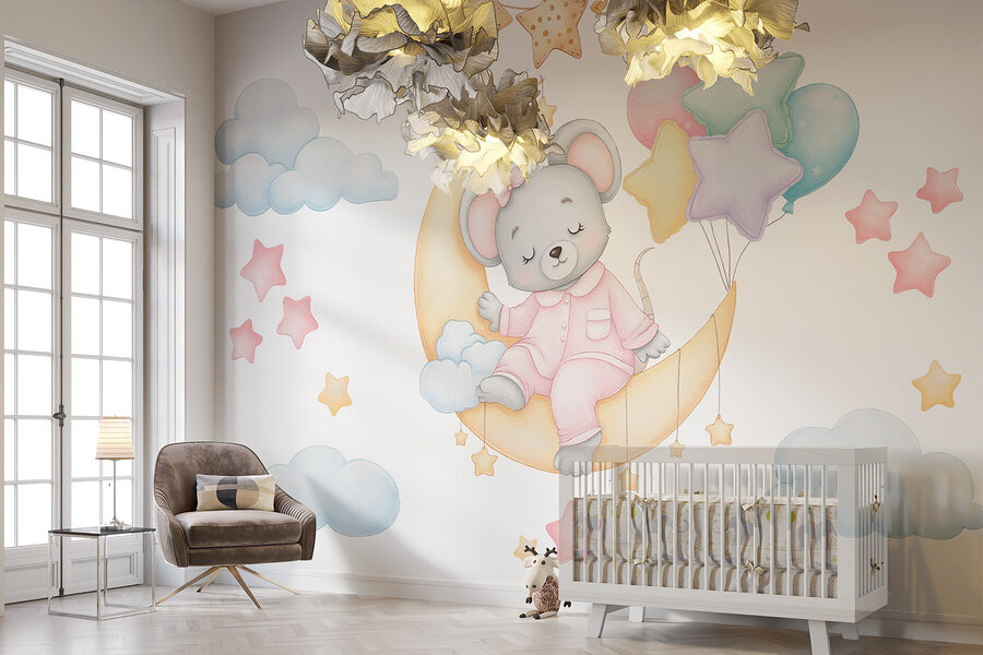 Bármely szobát álomszerű meneküléssé varázsolhatsz ezzel a varázslatos falfestménnyel, amelyen egy egér bújik meg a holdon, színes lufikat szorongatva. Képzeld el, ahogy a lágy fény megvilágítja az apró csillagokat, miközben a kisgyermeked álomba merül, és a felhők között szeszélyes kalandokról álmodik. Olyan, mint egy életre kelt esti mese – tökéletes gyerekszobába vagy játszószobába! A pasztellszínek megnyugtató hangulatot teremtenek, így könnyen elképzelhető, hogy ez a bájos jelenet milyen kacagást és édes álmokat ihlethet. Adj egy kis varázslatot a falakra, és hagyd, hogy a képzelet szárnyaljon!