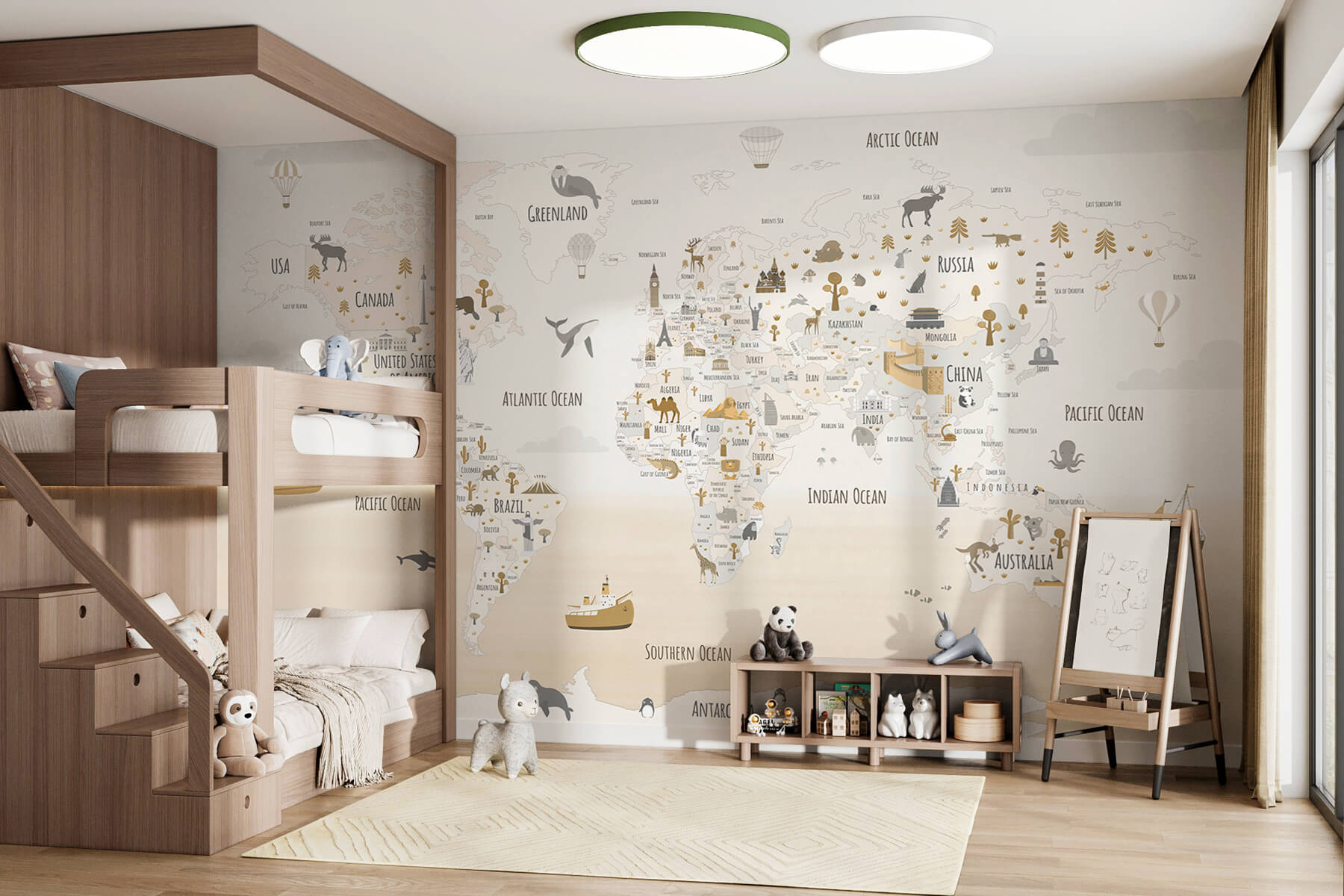 Bármilyen teret alakítson át egy kis kalandos zónává a fali falfestményekkel A világ térképe. Képzeld el, ahogy a gyerekek keresztbe tett lábbal, csillogó szemekkel ülnek, és ujjaikkal végigsimítják a kontinenseket és óceánokat. Ez a falfestmény nem csupán művészet; ez egy felhívás a felfedezésre és a tanulásra. Az állatok és ikonikus nevezetességek játékos illusztrációival kíváncsiságot ébreszt és beindítja a képzeletet. Akár a gyerekszobában, akár a dolgozószoba sarkában, olyan szeszélyes hangulatot kölcsönöz, amely minden pillantást egy mini kirándulásnak érezhet. Ki tudja? Talán inspirál néhány jövőbeli világutazót! Dobd fel a falakat, és kezdődhet a vándorlás!
