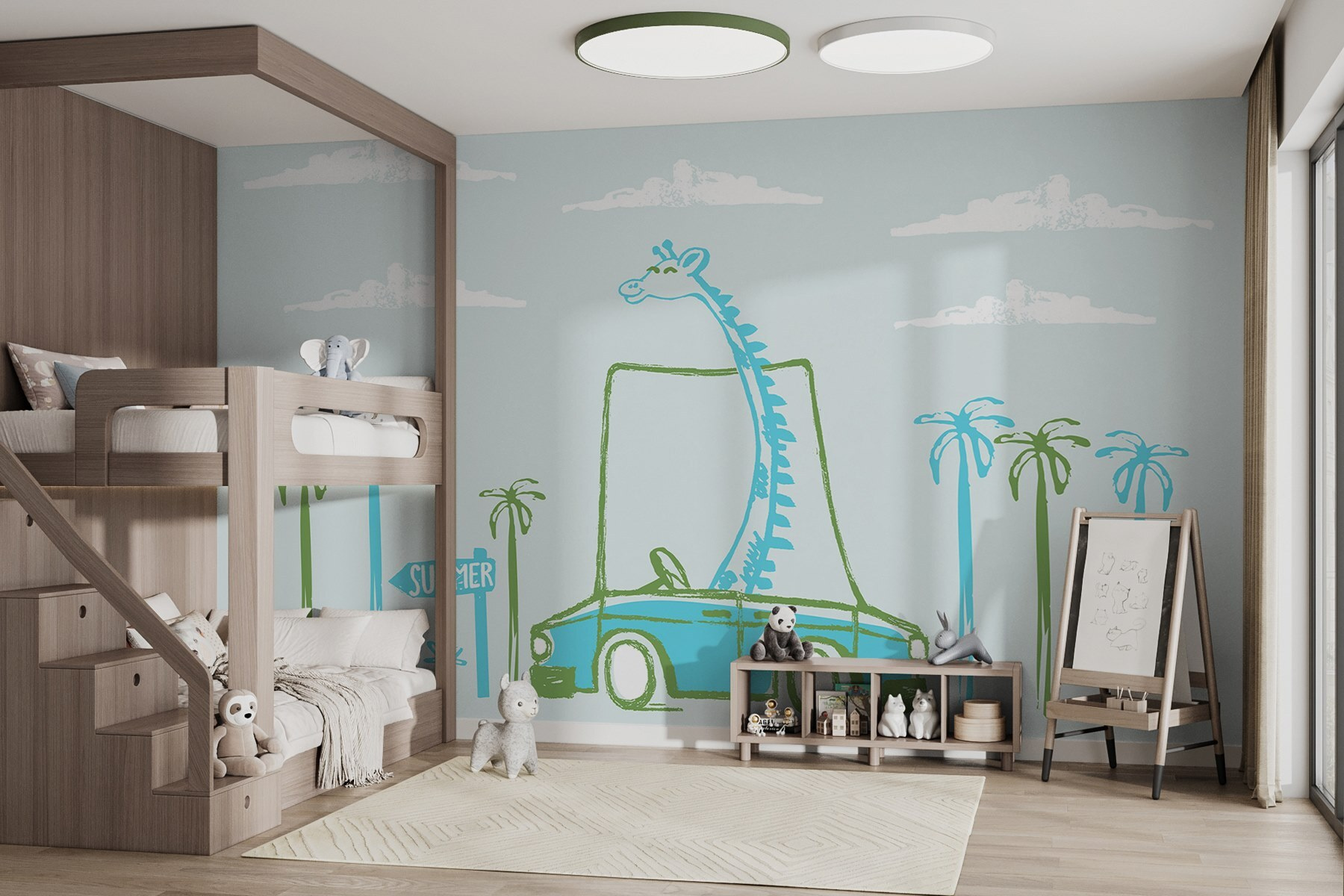 A “Zsiráf az autóban” falfestmény segítségével egy kis szeszélyt varázsolhatsz a falakra. Ez a bájos dizájn egy elbűvölő zsiráfot ábrázol, amely egy régi kék autóból kukucskál ki, körülötte játékos pálmákkal és pelyhes felhőkkel. Olyan, mint egy jegy egy napsütéses napra minden alkalommal, amikor belépsz a szobába. Képzeld el, ahogy kávét szürcsölgetsz és kuncogsz a puszta szórakozáson. Tökéletes gyerekszobába vagy otthonod mókás sarkába, ez a falfestmény mosolyra késztet és beszélgetésekre késztet. Ráadásul ki ne szeretne egy óriási zsiráfot másodpilótának? Ez nem csak dekoráció; ez egy kis kaland, ami csak arra vár, hogy megtörténjen.