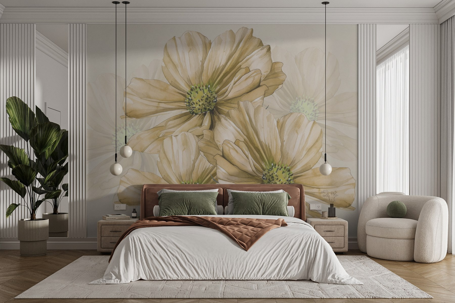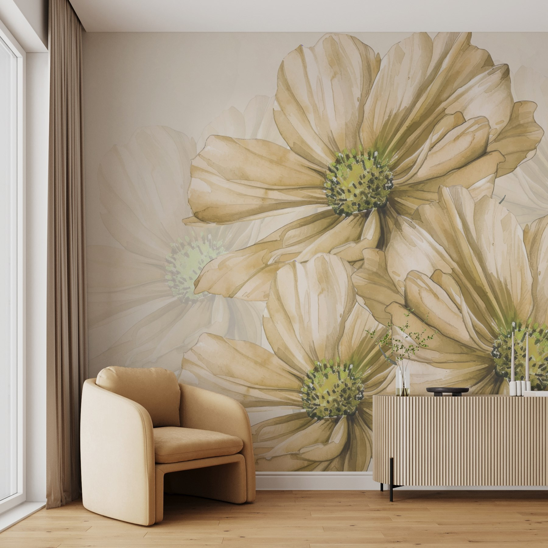 Bármilyen teret alakítson át egy nyugodt visszavonulássá ezzel a falfestménnyel, amely egy magával ragadó virágcsoportot ábrázol. Képzelje el ezeket a finom virágokat, amelyek bájos zöld közepükkel lágyan ringatóznak a szellőben – olyan, mintha egy friss kert lenne az otthonában. Ideális a természet szerelmeseinek vagy bárkinek, aki egy kis nyugalomra vágyik, ez az akvarell művészet elrepíti Önt a napsütéses napokra és a meleg hangulatra. Képzelje el, hogy teát szürcsölget, miközben ezt a freskót bámulja, és hagyja, hogy a képzelete sétát tegyen az álmok mezőin. Ez több mint dekoráció, ez egy meghívás a lazításra és a lélegzetvételre. Fogadd el a szépséget, és hagyd, hogy feldobja a napodat.