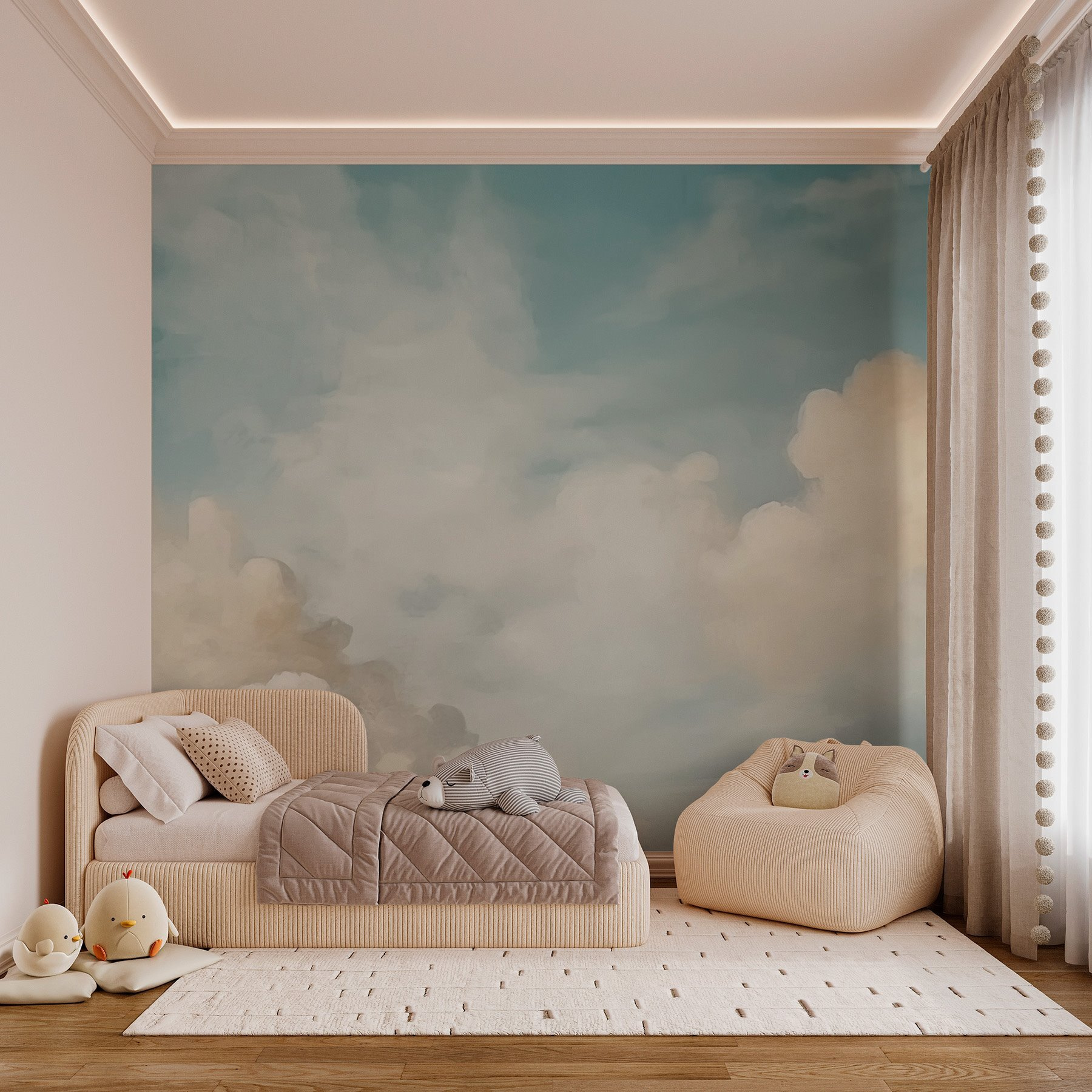 Alakítsa át terét ezzel a lenyűgöző “Felhők az égen” falfestménnyel. Képzelje el – puha, bolyhos felhők, amelyek lustán sodródnak a ragyogó kék égbolton. Olyan, mintha a nyugodt természet egy szeletét hoznád be a szobádba. Ideális egy hangulatos olvasósarokba vagy egy élénk játszószobába, ez a falfestmény álmodozásra és végtelen kalandokra invitál. Képzelje el, ahogy a gyerekek felnéznek, alakzatokat képzelnek el, vagy ahogy Ön egy csésze kávé mellett élvez egy békés pillanatot. A nyugalmat a szeszélyességgel egyensúlyozza, így tökéletes mindenkinek, aki egy kis varázslatra vágyik az életében. Egyszerűen nem lehet nem mosolyogni, ha megpillantod! Tökéletesen hangulatos, könnyedén bájos – mit nem lehet szeretni?