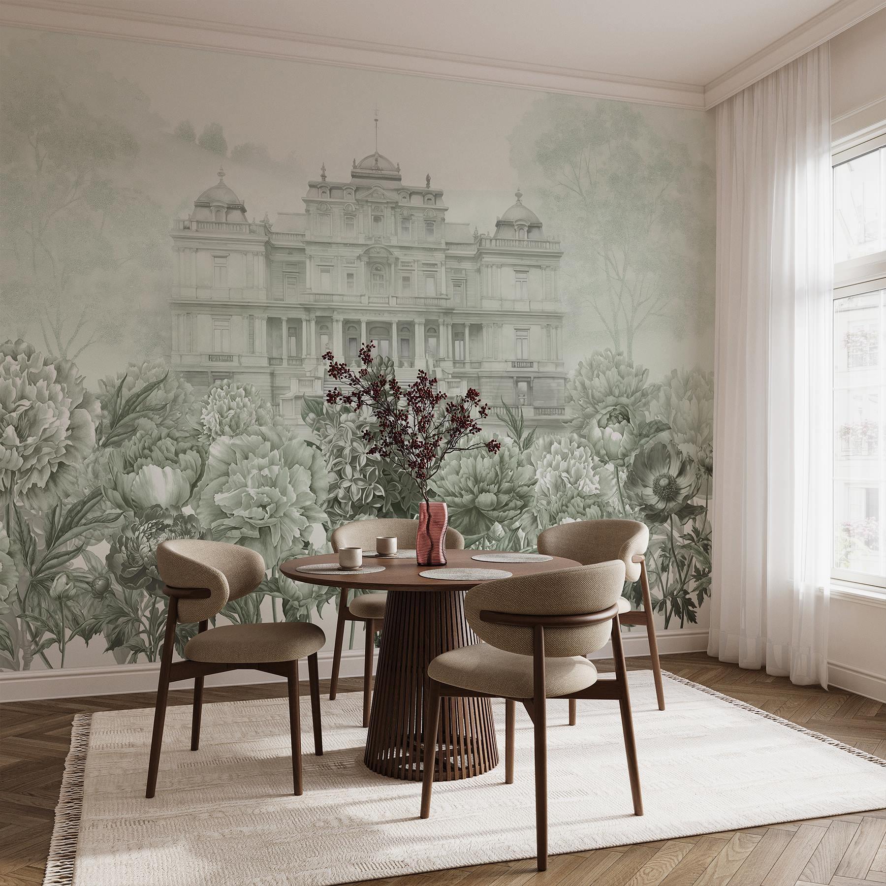 Alakítson át bármilyen teret ezzel a lenyűgöző falfestménnyel, amely egy nagy fehér épületet és vibráló virágokat ábrázol. Képzelje el, hogy belép egy szobába, és egy gyönyörű bazsarózsa-robbanás fogadja, miközben a fenséges háttér csendesen parancsolja a figyelmet. Olyan, mintha egy darab nyugodt kerti varázslatot hoznál be a belső térbe. Tökéletes azok számára, akik szeretik a természet bájával kevert eleganciát, ez a falfestmény nyugtató hangot adhat, vagy örömteli beszélgetéseket indíthat el. Képzelje el, ahogy a barátok teázás közben megcsodálják a részleteket, vagy ahogy egy hangulatos moziestet egy kicsit különlegesebbnek éreznek. Tökéletes befejezése bármely stílusosan virágzó otthonnak.