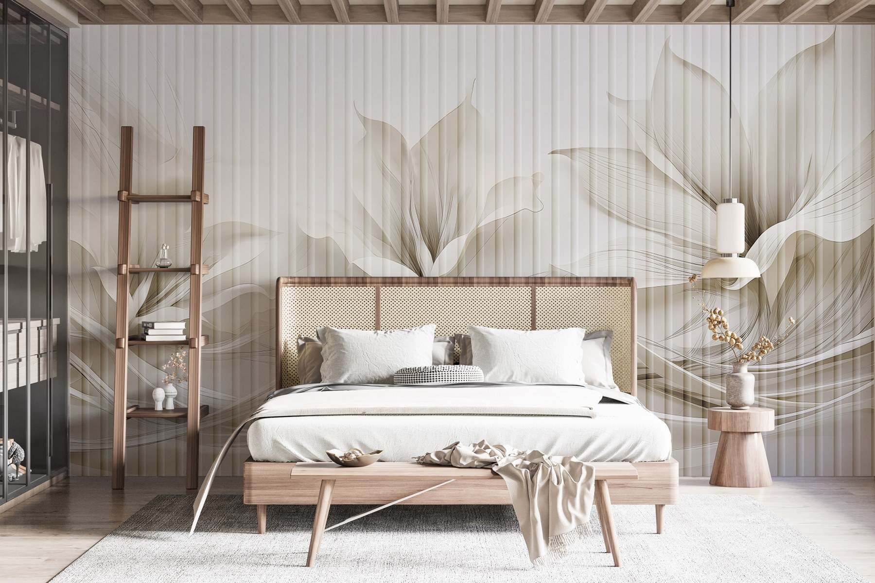 Alakítsa át terét ezzel a lenyűgöző falfestménnyel, amely elegáns, áramló vonalakkal összefonódó virágmintát ábrázol. Képzelje el, hogy belép egy olyan szobába, ahol a lágy, tompa árnyalatok azonnal megnyugtatják az érzékeket. Olyan, mint egy lélegzetvételnyi friss levegő! Ez a falfestmény nem csupán dekoráció; szelíd emlékeztető a természet szépségére. Képzelje el, hogy kávézási randevúkat vagy hangulatos estéket tart, ahol minden pillantás a falra örömöt ébreszt. A barátok talán még azt is megkérdezik, hol találtál ilyen gyöngyszemet. Ez a modern stílus és az időtlen báj tökéletes keveréke, amely könnyedén teremt barátságos hangulatot. Ideális azok számára, akik anélkül szeretnék felfrissíteni otthonukat, hogy az érzékeket túlterhelnék.