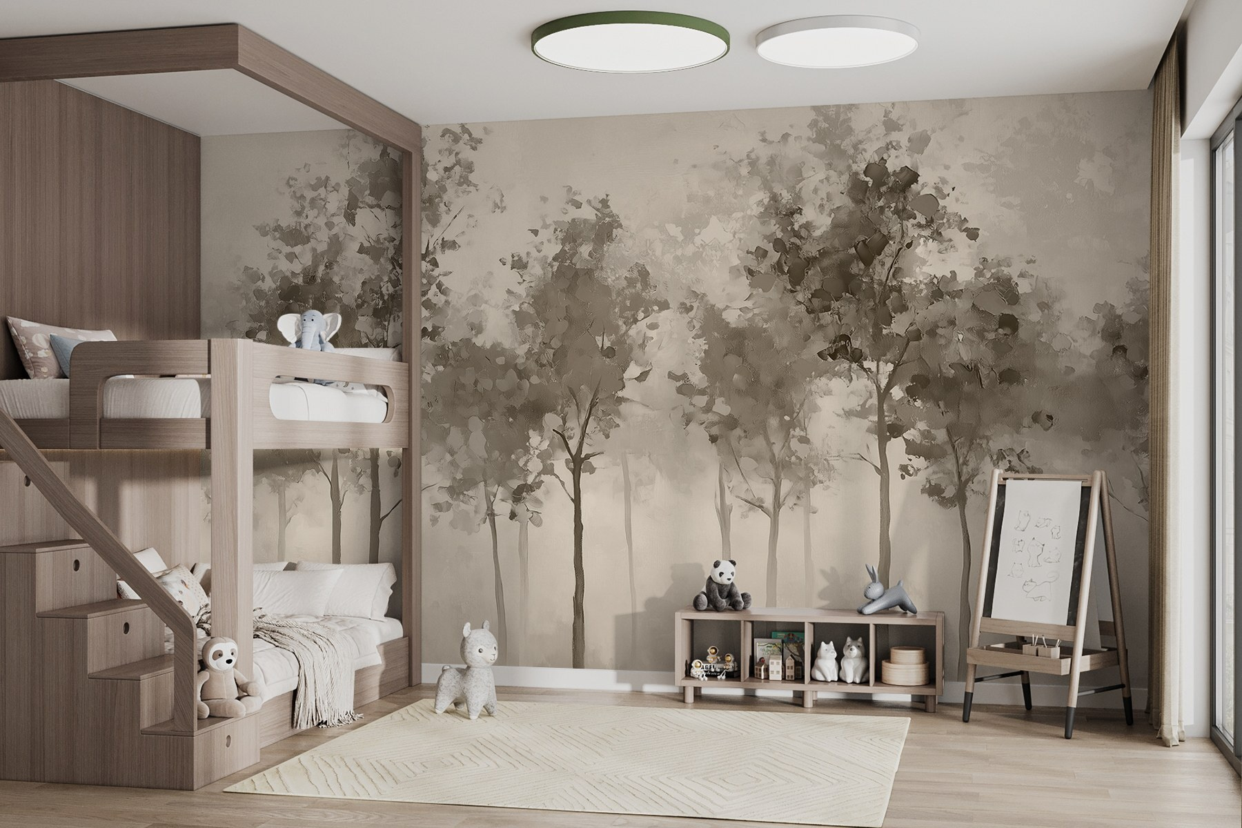 Alakítson át bármilyen helyiséget nyugodt pihenőhellyé ezzel a varázslatos falfestménnyel, amely lágy ködbe burkolt fákat ábrázol. Képzelje el, ahogy a reggeli kávéját kortyolgatva elveszik a nyugodt, tompa tónusokban, amelyek mintha a természet édes neszeit suttognák. Olyan, mintha egy békés erdőt hozna be a lakótérbe. Ez a falfestmény nem csak dekoráció; hangulatjavító. Tökéletes azok számára, akik egy kis nyugalomra vágynak anélkül, hogy a levelek és az állatokat az otthonukban látnák. Ráadásul ki ne szeretné egy kicsit is úgy érezni magát, mintha egy álomszép erdei menedékhelyen lenne?