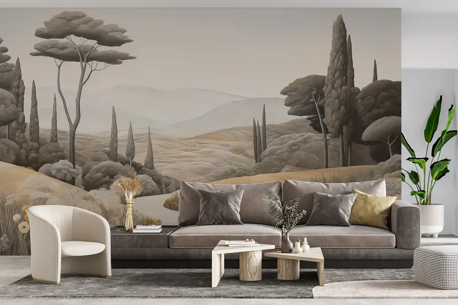 Alakítsa át terét ezzel a lenyűgöző falfestménnyel: “Tájkép kanyargós úttal és fákkal”. Egy nyugodt vidéket elevenít meg, meghívva a természetet a beltérbe, a kültéri rendetlenség nélkül. Képzelje el, ahogy egy lusta vasárnapon kávét szürcsölget, miközben a szelíd dombokat és a ringatózó fákat bámulja – olyan, mint egy mini vakáció a falán. Ez a falfestmény tökéletes az álmodozó pillanatokhoz, és meleg, földes tónusokba és lágy részletekbe burkolja szobáját, amelyek mély lélegzetvételre késztetnek. Pihenést sugároz, és a szabad ég alatt tett békés sétákra emlékeztet. Képzelje el a beszélgetéseket, amelyeket kiválthat, vagy a nyugodt hangulatot, amelyet hoz – milyen édes érintés bármelyik zugba!