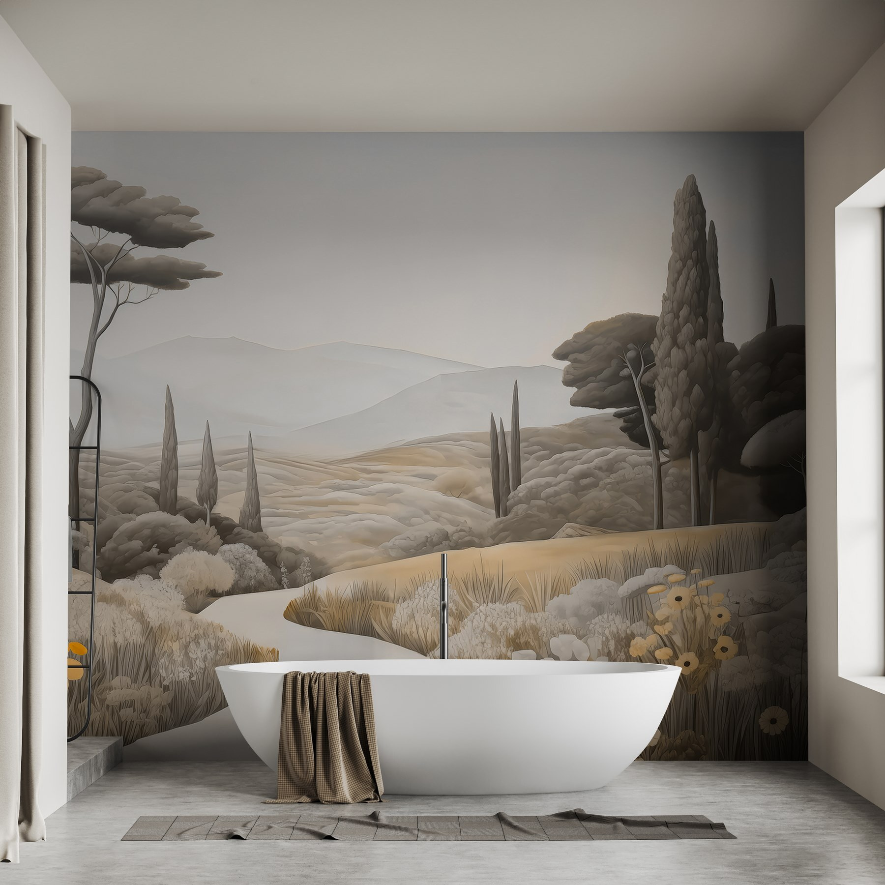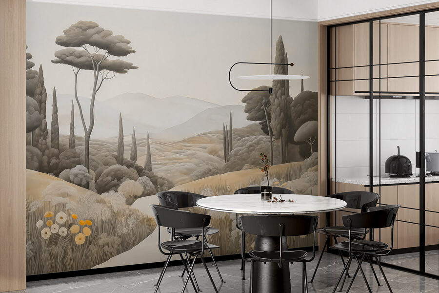 Alakítsa át terét ezzel a lenyűgöző falfestménnyel: “Tájkép kanyargós úttal és fákkal”. Egy nyugodt vidéket elevenít meg, meghívva a természetet a beltérbe, a kültéri rendetlenség nélkül. Képzelje el, ahogy egy lusta vasárnapon kávét szürcsölget, miközben a szelíd dombokat és a ringatózó fákat bámulja – olyan, mint egy mini vakáció a falán. Ez a falfestmény tökéletes az álmodozó pillanatokhoz, és meleg, földes tónusokba és lágy részletekbe burkolja szobáját, amelyek mély lélegzetvételre késztetnek. Pihenést sugároz, és a szabad ég alatt tett békés sétákra emlékeztet. Képzelje el a beszélgetéseket, amelyeket kiválthat, vagy a nyugodt hangulatot, amelyet hoz – milyen édes érintés bármelyik zugba!