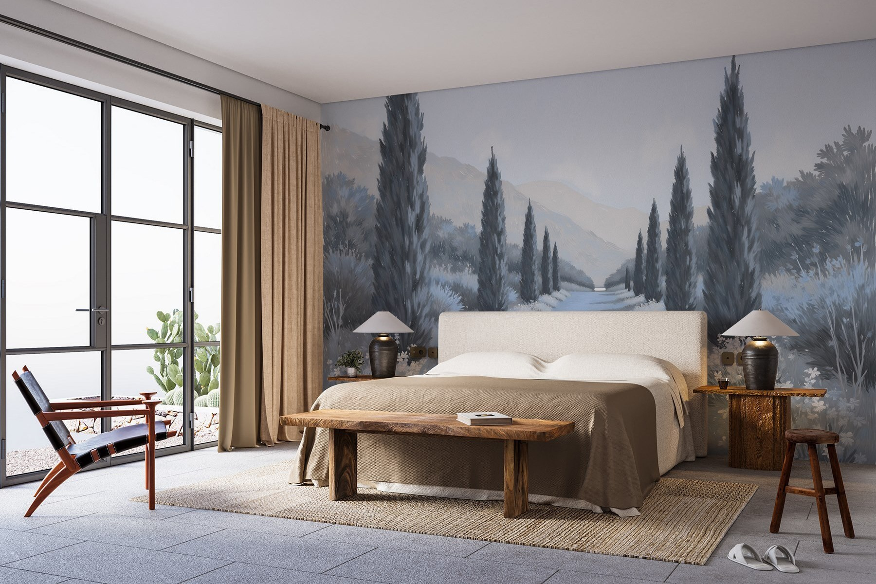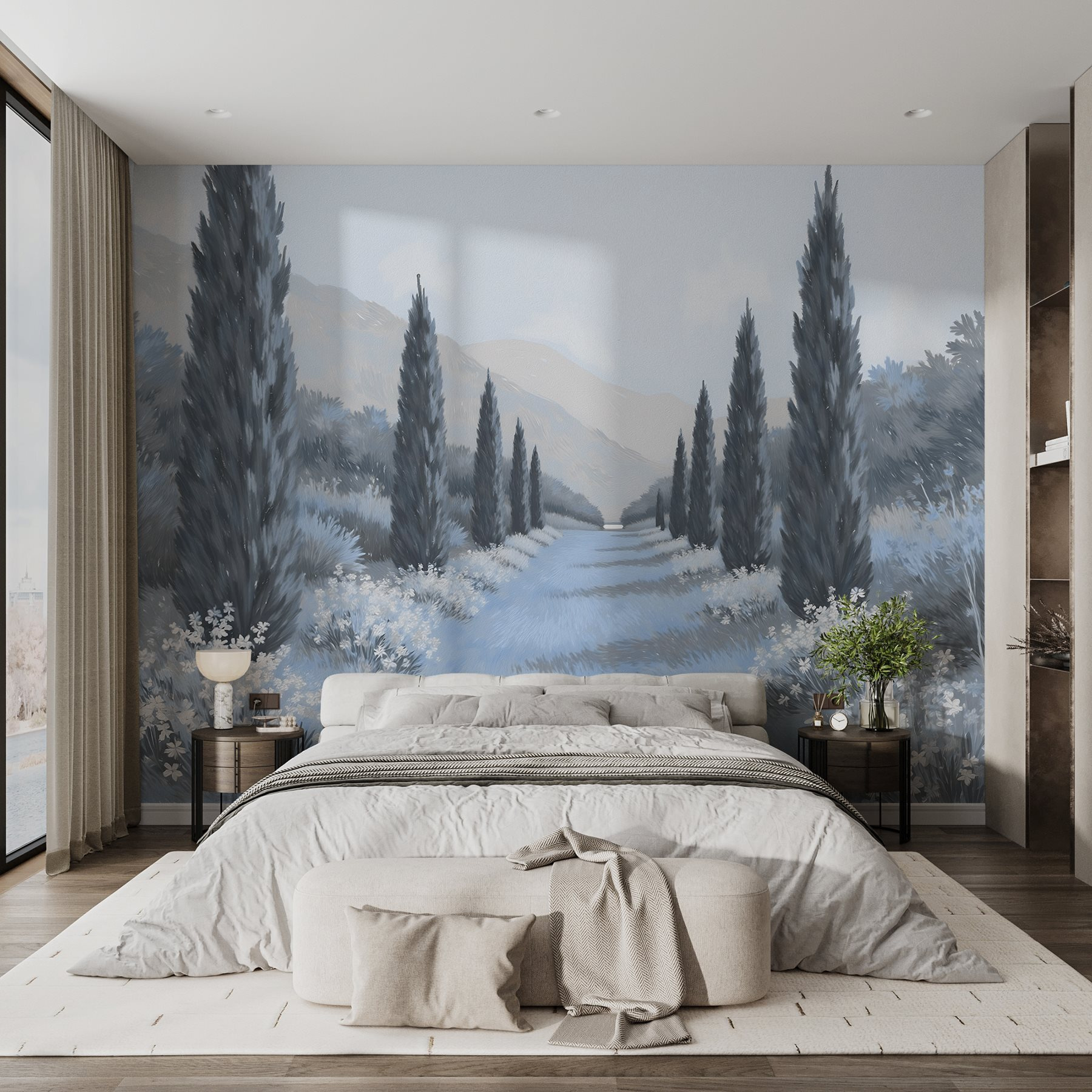 Alakítsa át terét ezzel a “Tájkép fákkal és virágokkal” című lenyűgöző falfestménnyel. Képzelje el, hogy egy nyugodt ösvényre lép, amelyet magas ciprusfák és finom virágok szegélyeznek, amelyek a természet titkairól suttognak. A lágy árnyalatok nyugodt légkört teremtenek, amely tökéletes a hosszú nap utáni kikapcsolódáshoz. Olyan, mintha egy kis friss levegőt vinnénk be a házba – bogarak nélkül!