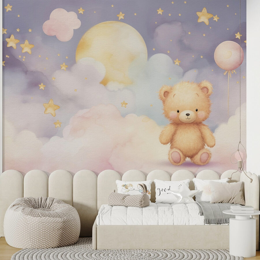Alakítsd át bármelyik gyermek helyiségét ezzel a varázslatos falfestménnyel, amelyen egy imádnivaló mackó hűsöl egy bolyhos felhőn. Képzelje el, hogy szobáját egy olyan darabbal díszíti, amely kacagást és álmodozást vált ki. A pasztellszínek lágy suttogásként táncolnak, így otthonos, mégis szeszélyes érzést keltenek. Olyan, mintha az ég egy darabját hoznád be a lakásba, tökéletes azokhoz a pillanatokhoz, amikor az esti mesék szárnyra kelnek. Képzeld el a kisgyermeked arcán az örömöt, amint észreveszi a csillogó csillagokat és a szelíden lebegő léggömböt. Ez nem csak dekoráció; ez egy kapu a képzelet és az édes álmok világába. Ez a falfestmény tökéletes a gyerekszobákba vagy a játszószobákba, melegséget és egy kis varázslatot kölcsönöz, így minden pillantás mosolyra késztet.