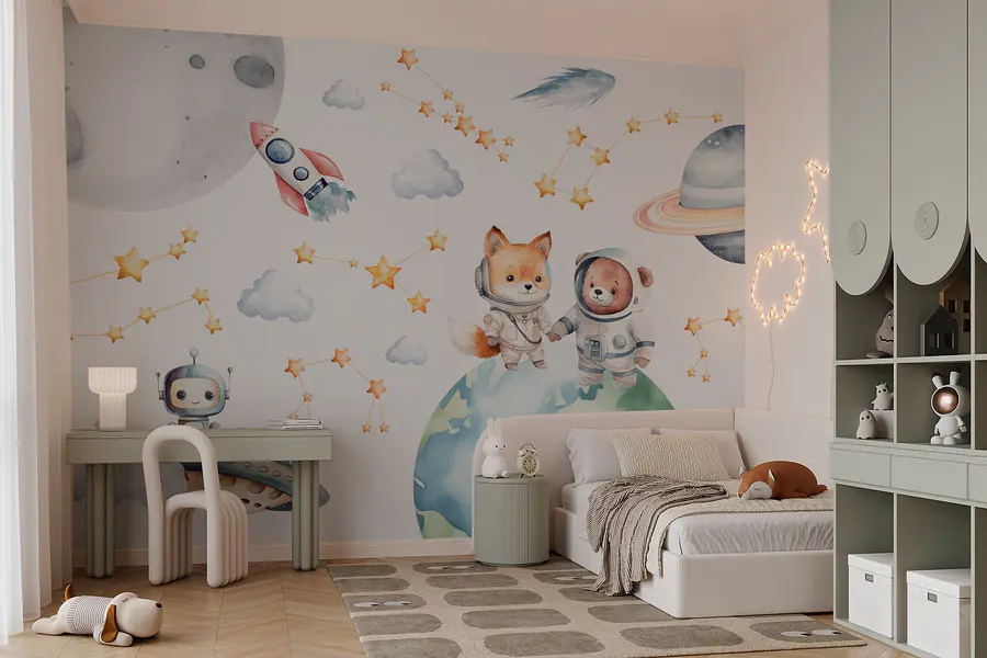 Bármelyik szobát kozmikus csodavilággá varázsolhatja ezzel a bájos falfestménnyel, amelyen akvarell állatokat láthat az űrben. Képzelj el egy hangulatos zugot, ahol egy kis róka és egy medve űrhajósruhába öltözve együtt fedezik fel a világegyetemet. Ahogy pasztellszínű bolygók és csillogó csillagok között lebegnek, szinte olyan, mintha meghívnának téged is, hogy csatlakozz csillagközi kalandjukhoz. Ez a falfestmény tökéletes a gyerekeknek vagy a fiatalabb korosztálynak, és szeszélyes, fantáziát ébresztő, szeszélyes hangulatot kölcsönöz. Képzeld el, milyen jó lenne egy könyvvel összegömbölyödni e vidám kozmosz alatt. Ez egy szelíd emlékeztető arra, hogy a csoda mindenütt ott van, még a saját otthonodban is. Az Ön tere lehet a galaktikus felfedezők következő nagyszerű központja – vagy csak egy meghitt hely az összebújáshoz és az álmodozáshoz.