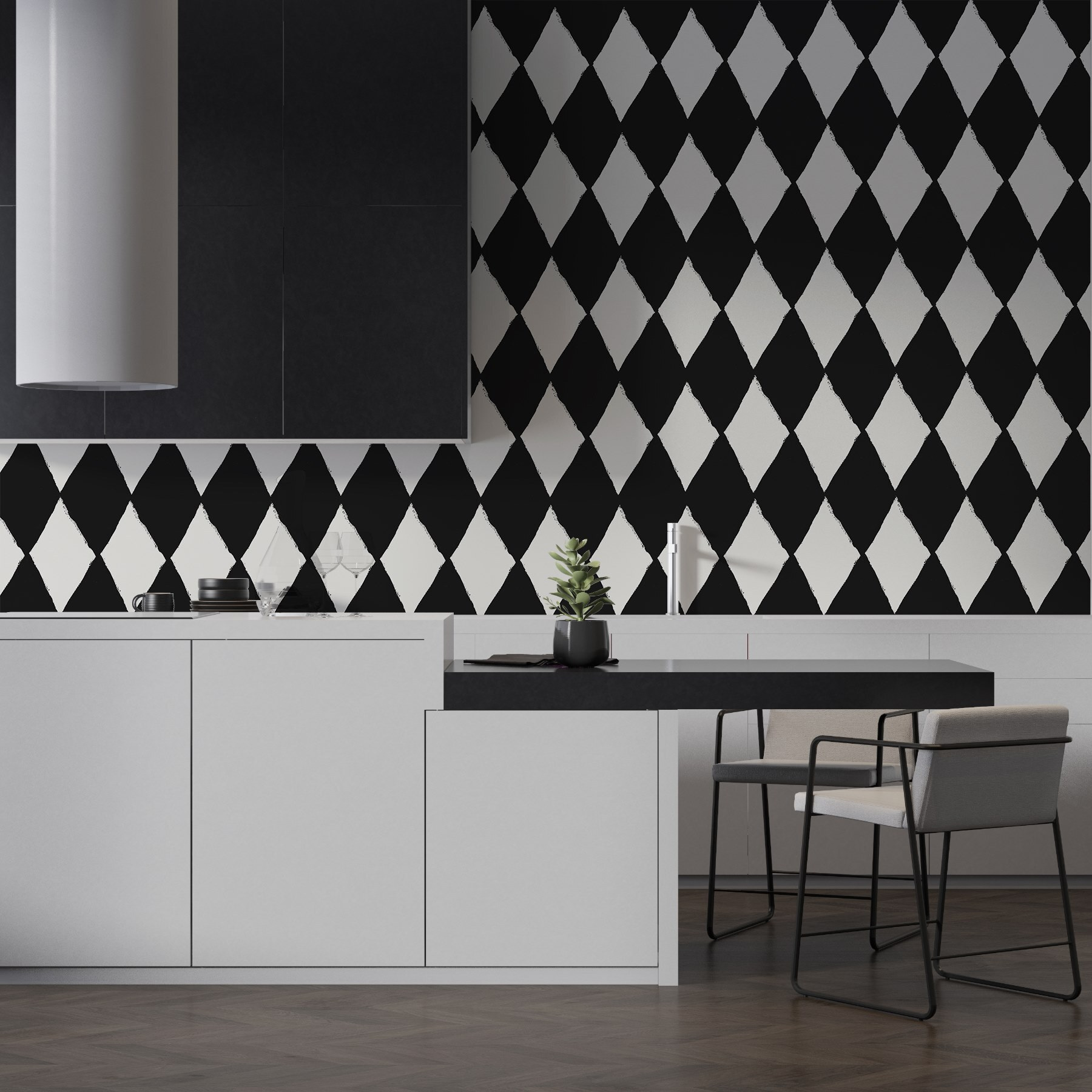 Alakítson át bármilyen unalmas falat stílusossá ezzel a fekete-fehér rombuszmintás falfestménnyel. Olyan, mintha friss ruhát adnál a szobádnak, azonnal feldobva a hangulatot. Képzelje el, hogy belép a helyiségébe, és egy merész, energikus dizájn fogadja, amely egyszerűen mosolyra fakasztja. A geometrikus minta egy csipetnyi modern hangulatot kölcsönöz anélkül, hogy túlzásba esne. Tökéletes egy hangulatos nappaliba vagy akár egy játékos hálószobába. Szeretné lenyűgözni a vendégeit? Ebben a falfestményben megvan a wow-faktor! Egy gyors beszélgetés a dekorációról most egy szórakoztató kalanddá változott. Készülj fel a bókokra!