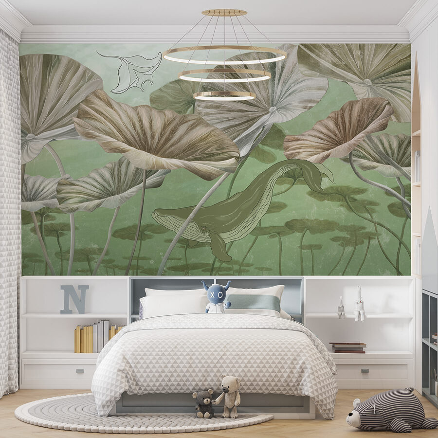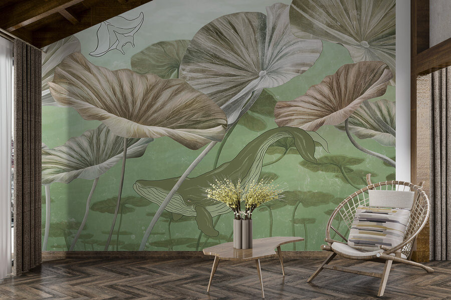 Merüljön el ennek a lenyűgöző falfestménynek a nyugodt hangulatában, melyen egy kecses bálna siklik a nyugodt vizeken. Képzelje el, hogy a helyisége egy víz alatti menedékké változik, ahol minden pillantás egy békés menekülésnek tűnik. A lágy zöldek és földszínek nemcsak az érzékeket nyugtatják meg, hanem a külvilágot is behívják, nyugodt légkört teremtve. Tökéletes a természet szerelmeseinek vagy bárkinek, akinek szüksége van egy kis nyugalomra, ez a falfestmény egy olyan művészeti réteget ad hozzá, amely kíváncsiságot és csodálkozást idéz. Olyan, mintha egy kis darabka óceán lenne az otthonában – nem szükséges sós víz. A bálna szelíd jelenléte könnyedén feldobja a szobát, beszélgetésekre és álmodozásra késztet. Miért ne engedné hát, hogy ez a gyönyörű tengeri élőlény kalandvágyat varázsoljon a falaira?