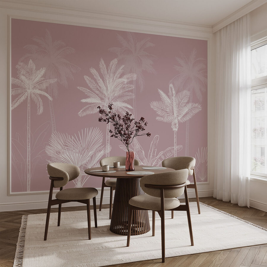 Alakítson át bármilyen helyiséget ezzel a bájos “Pálmafacsoport” falfestménnyel. Képzelje el, hogy minden alkalommal, amikor belép a helyiségbe, egy nyugodt trópusi üdülőhelyre lép. A lágy, visszafogott rózsaszín háttér meghitt hangulatot áraszt, így tökéletes hátteret biztosít egy hosszú nap utáni pihentető estéhez. Olyan, mintha a lakásodban hirtelen óceáni szellő fújna – a homokot leszámítva a cipődben. Azok a bonyolultan rajzolt pálmák eleganciát kölcsönöznek, de nem veszik magukat túl komolyan. A nappalitól az otthoni irodáig, ez egy játékos bólintás a természetre, amitől a falak életre kelnek. Tökéletes az álmodozáshoz!