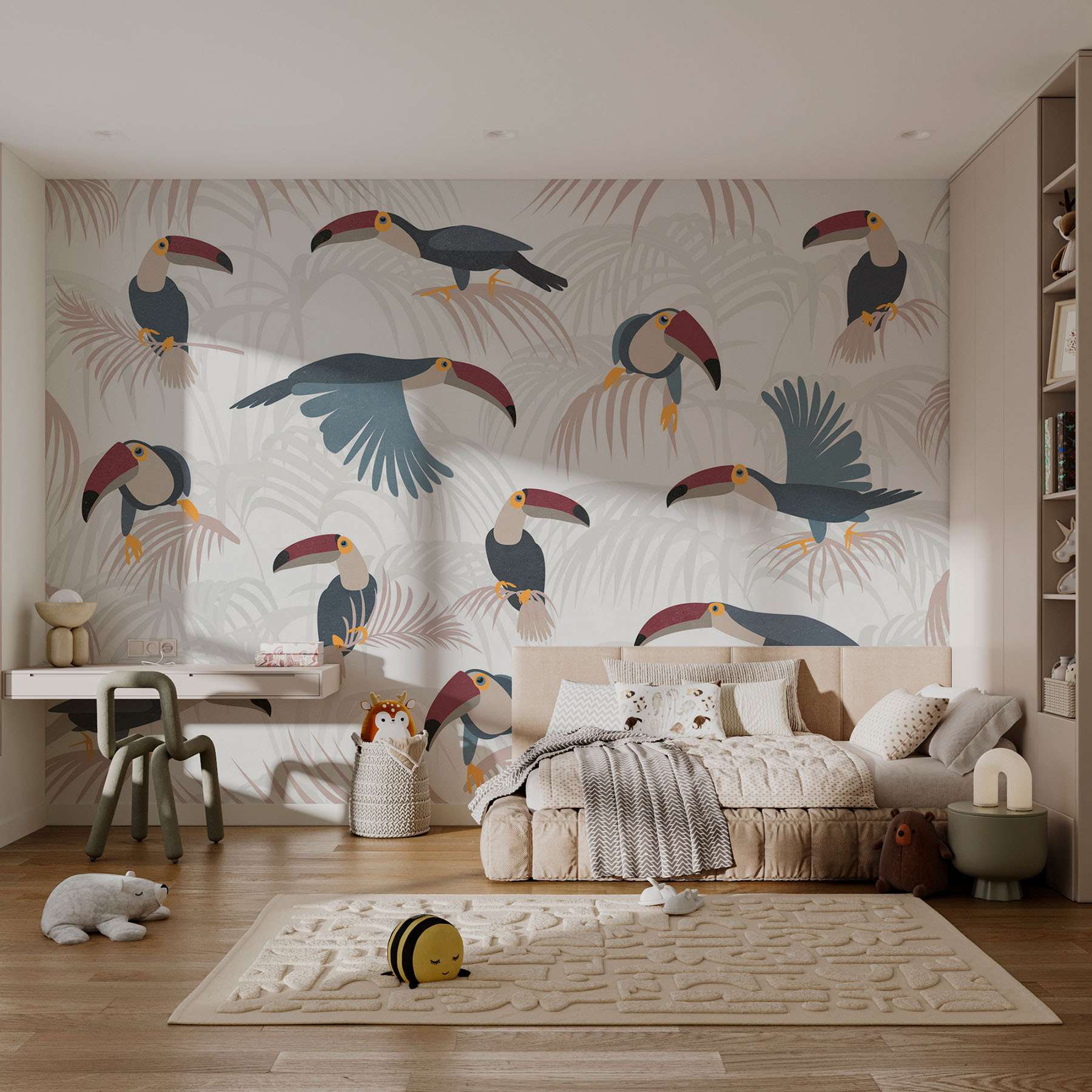 Képzelje el, hogy egy olyan térbe lép, amely olyan, mint egy trópusi menedék, ahol a madarak és a buja növények vibráló mintái azonnal feldobják a hangulatot. Ez a falfestmény, amely játékos pálmalevelek között ücsörgő, mókás tukánokkal nyüzsgő, melegséget és szeszélyt visz bármelyik falra. Olyan, mintha a természet egy vidám kis darabkája lenne a házban – tökéletes azokon a napokon, amikor csak el akarsz menekülni! Akár egy hangulatos nappalit dob fel, akár egy otthoni irodát dob fel, ez a falfestmény stílusos kikapcsolódásra invitál. Ki ne mosolyogna a kíváncsi madarak láttán? Hagyja, hogy a színek táncra perdüljenek, és bármelyik helyiséget vidám paradicsommá varázsolja.