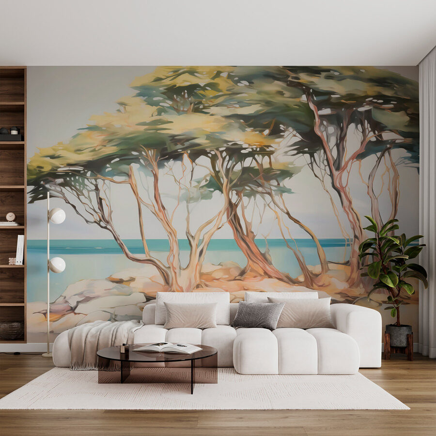 Képzelje el, hogy belép egy szobába, és azonnal úgy érzi, mintha egy hangulatos sziklás szigetre sétált volna – milyen tökéletes ez? Ez a falfestmény egy bájos facsoportot mutat be a parton, amely a szelíd szellő és az óceán hullámairól suttog meséket. A lágy akvarell vibrálás olyan szeszélyes és álmodozó hangulatot kölcsönöz, amelynek nehéz ellenállni. Képzelje el egy nappaliban vagy egy nyugodt hálószobában, ahol álmodozásra és lusta délutánokra invitálja. Olyan, mint egy minivakáció a falon, amely mindenkit arra emlékeztet, hogy lassítson és élvezze a szépséget. Ki ne vágyna minden nap egy ilyen kikapcsolódásra?