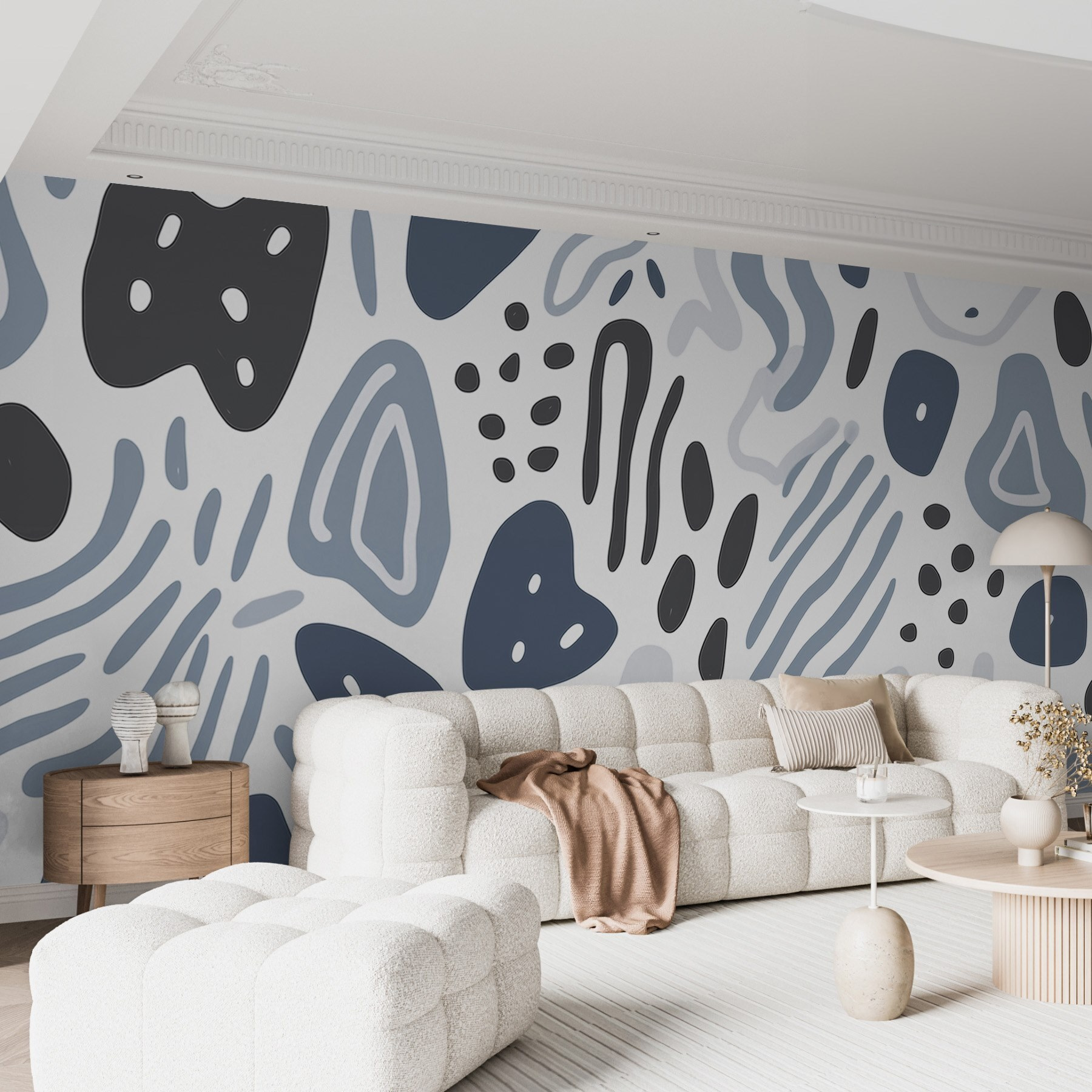 A tér átalakítása gyerekjáték ezzel a mesés falfestménnyel, amely szórakoztató formák és hűvös színek patchworkjét tartalmazza. Képzelje el, hogy egy olyan szobába lép, amely úgy érzi, mintha egy kis vidám táncot járna – minden grafikai elem magával ragadja Önt. Absztrakt, de barátságos, játékos hangulattal, amely szinte beszélgetésindítónak hat.
